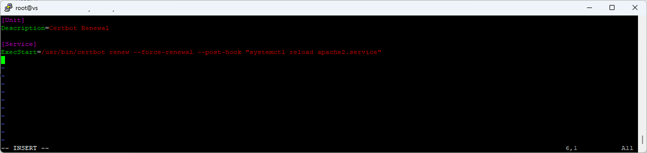 ExecStart=/usr/bin/certbot renew --force-renewal --post-hook "systemctl reload apache2.service"Обращаю внимание на опцию --post-hook, с помощью этой опции мы будем обновлять конфигурационный файл Apache после перевыпуска сертификата.