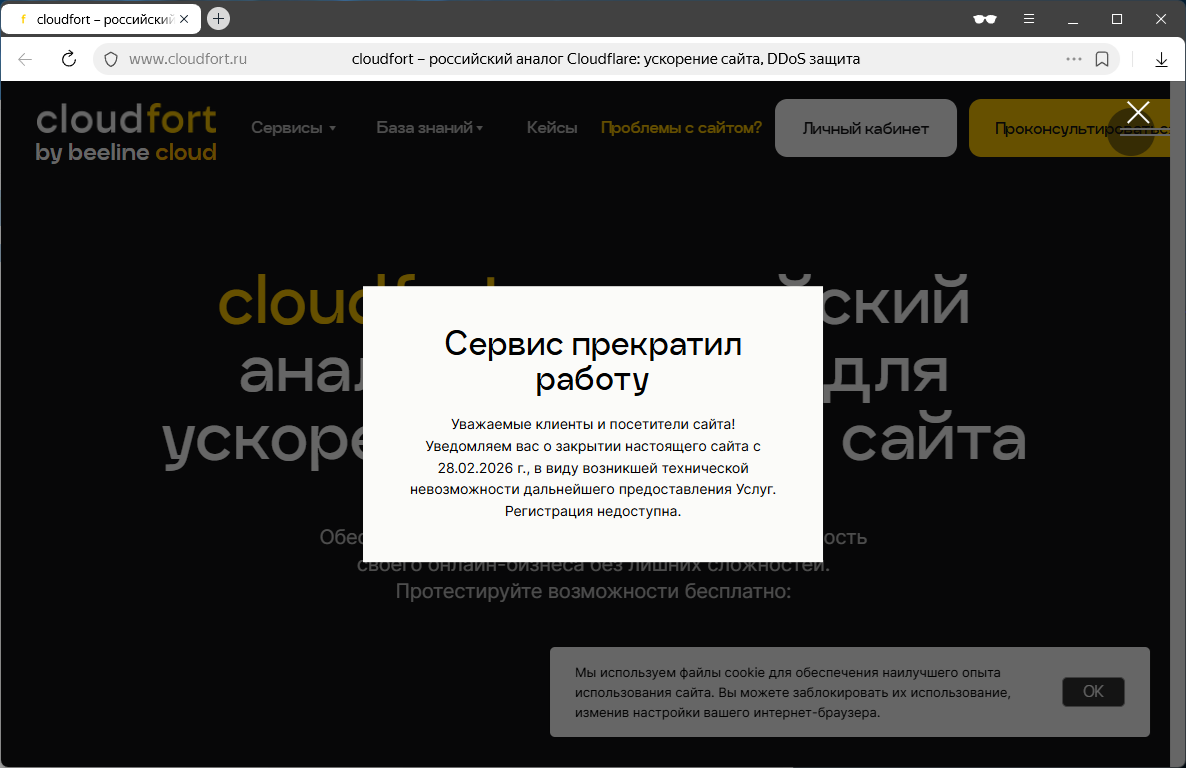 Российский аналог Cloudflare для ускорения и защиты сайта под названием CloudFort от Beeline Cloud закрылся. Официальной прекращение работы 28 февраля 2026 года. Но информационные канали заметили это только недавно.