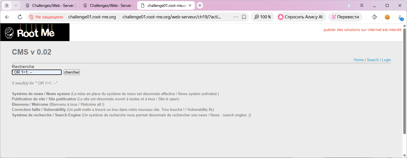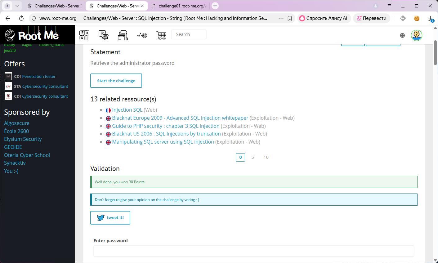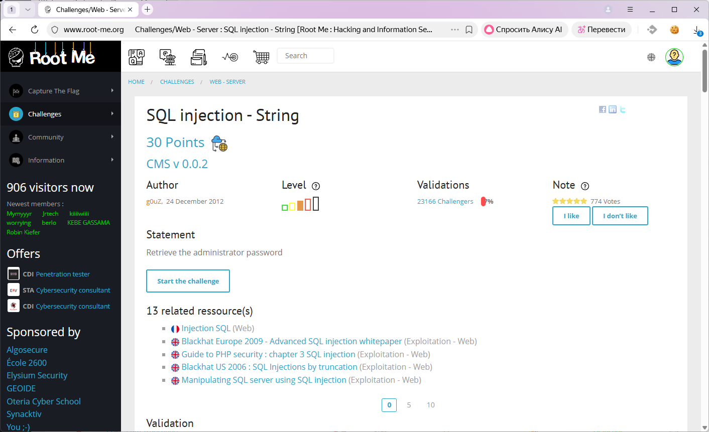 Всем привет, что-то я приболел, так что самое время решить задачку на информационную безопасность web-серверов. Сегодня задачка с портала root-me.org, называется "SQL injection - String". За решение задачки дают 30 баллов, ближе к среднему уровню.