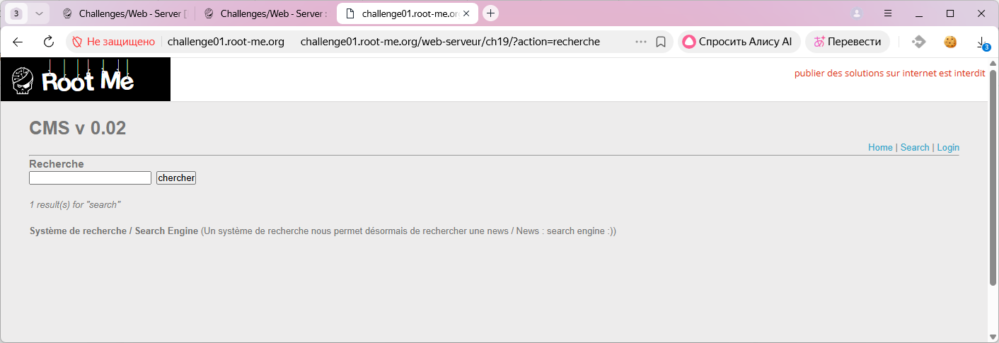 Переходим на страницу поиска. Здесь можно вбить поисковую строку. Я сказал "строку"? Вероятно, это место, где мы будем искать инъекцию.