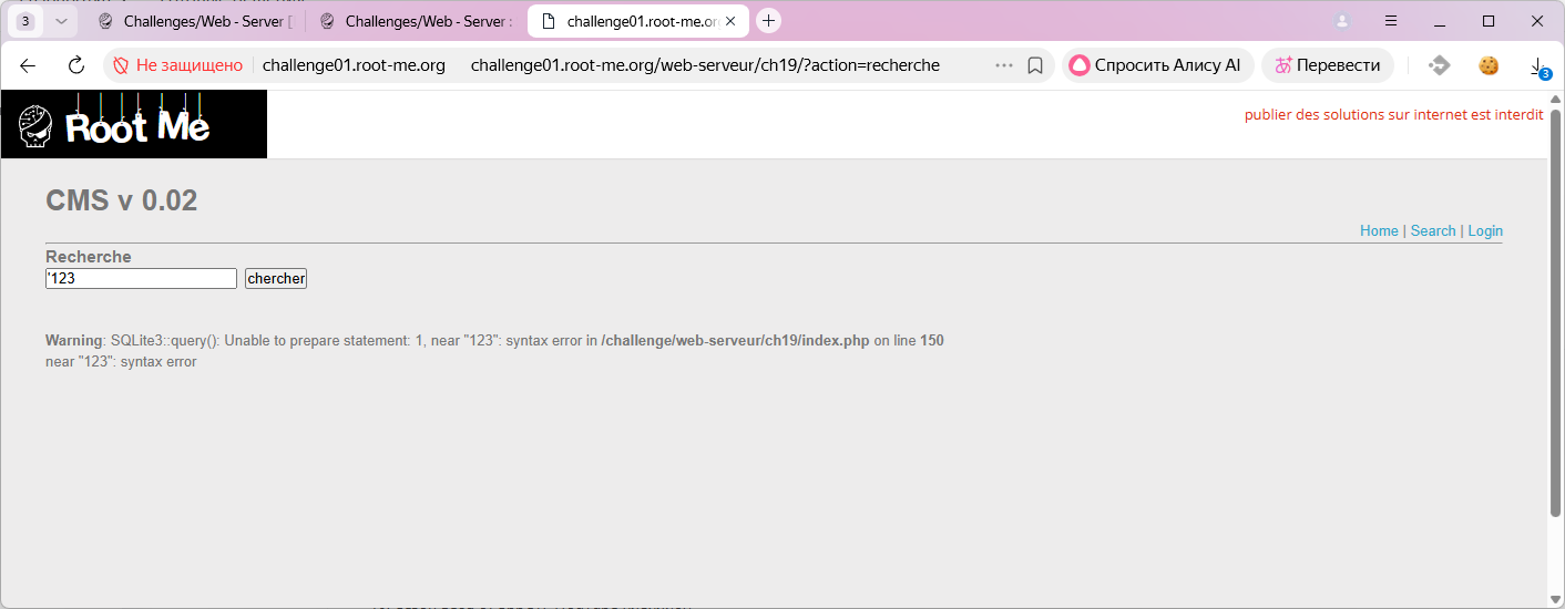 Обычный способ сделать инъекцию в SQL код — это использовать символ кавычки. Попробуем что-нибудь поискать с одинарной кавычкой, например: