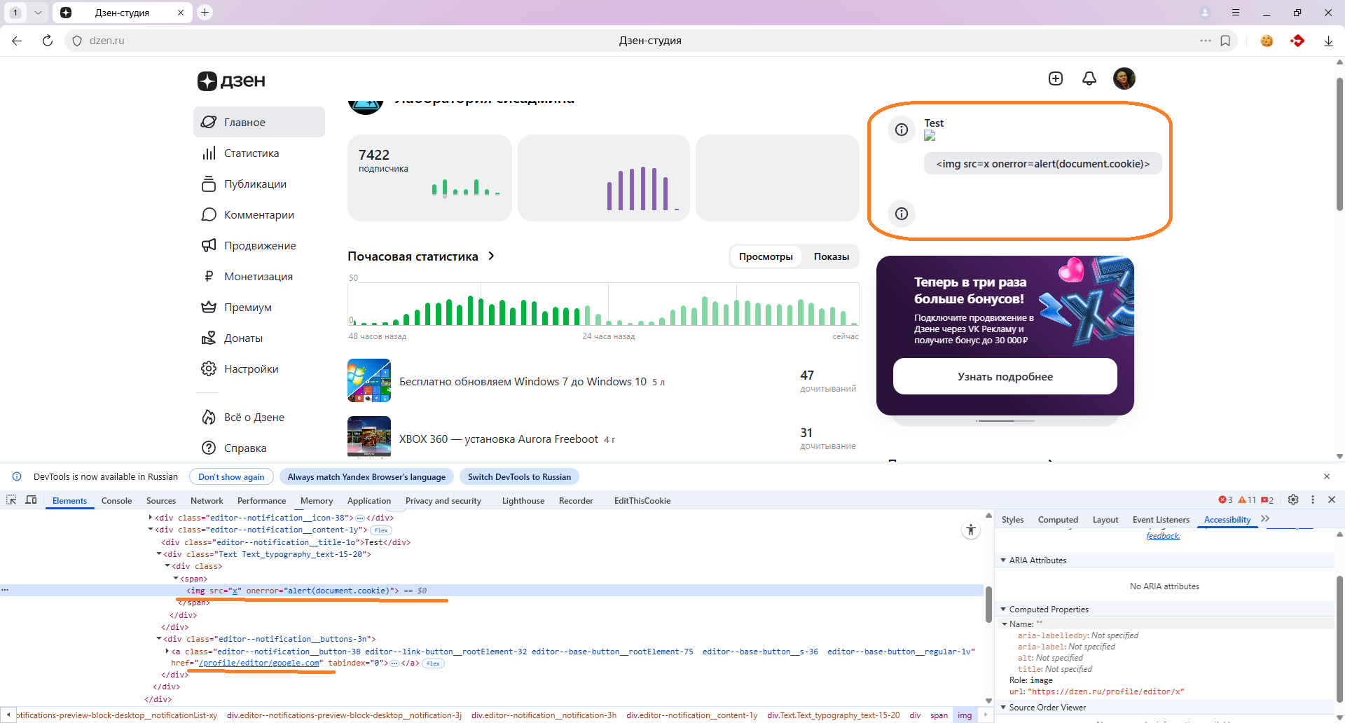 Сегодня ночью обнаружил неприятность в личном кабинете Дзена. Заметил попытку внедрения скрипта на страницу. На страничке отображалась картинка с неверным адресом и кодом: