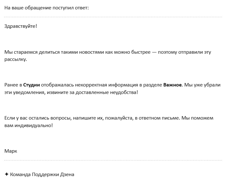 Незамедлительно в службу поддержки Дзен было отправлено уведомление. Утром пришёл ответ.