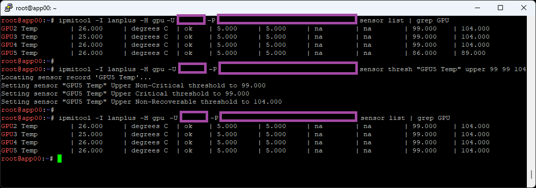 ipmitool -I lanplus -H хост -U логин -P пароль sensor thresh "GPU5 Temp" upper 99 99 104Вот и всё. Система приведена в стабильное состояние.