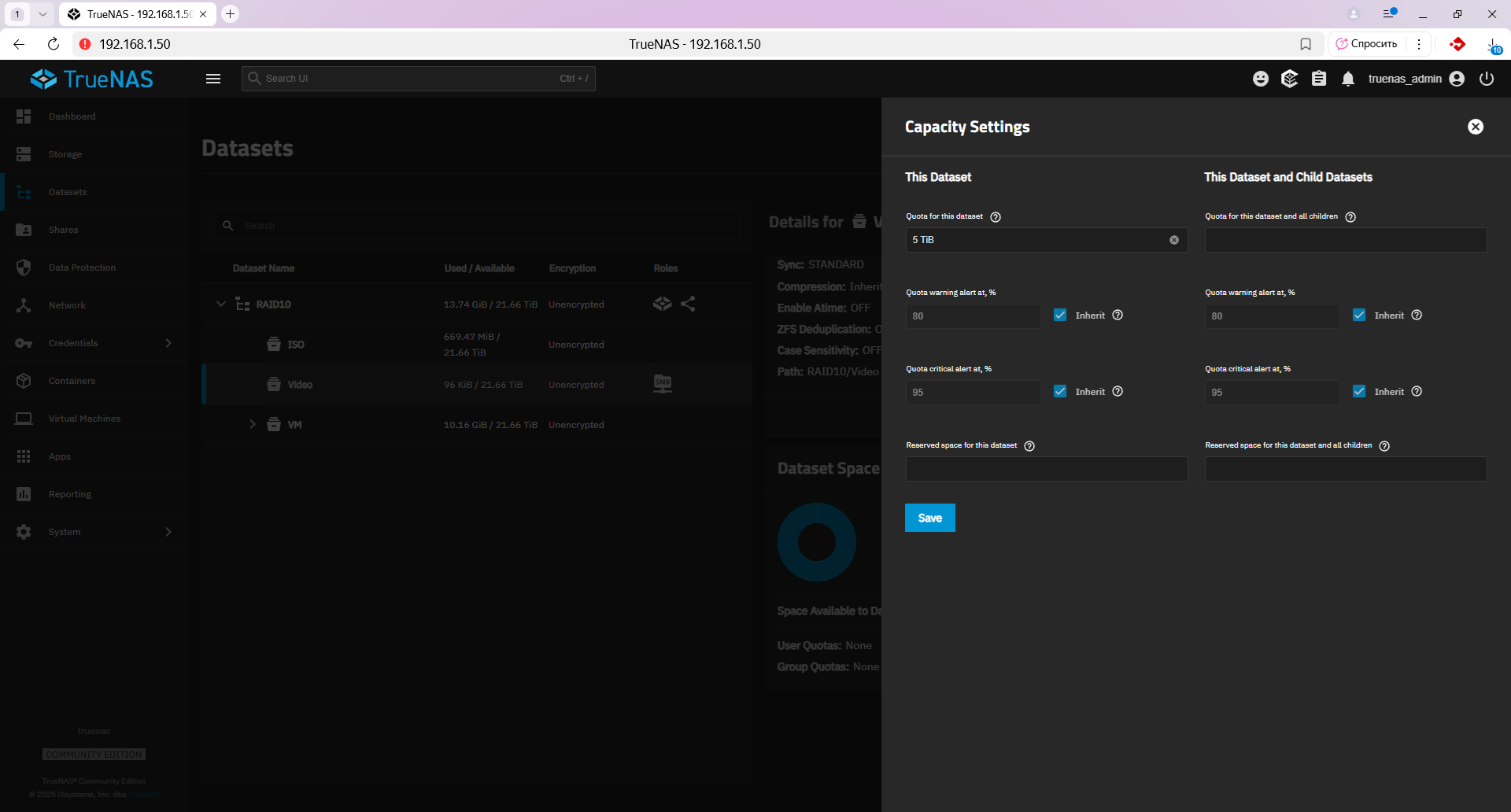 Сетевой диск примонтирован. Но что-то мне не нравится, что нет ограничений но объём, нужно ограничить, пусто будет 5 ТБ. 5 ТБ должно быть достаточно.