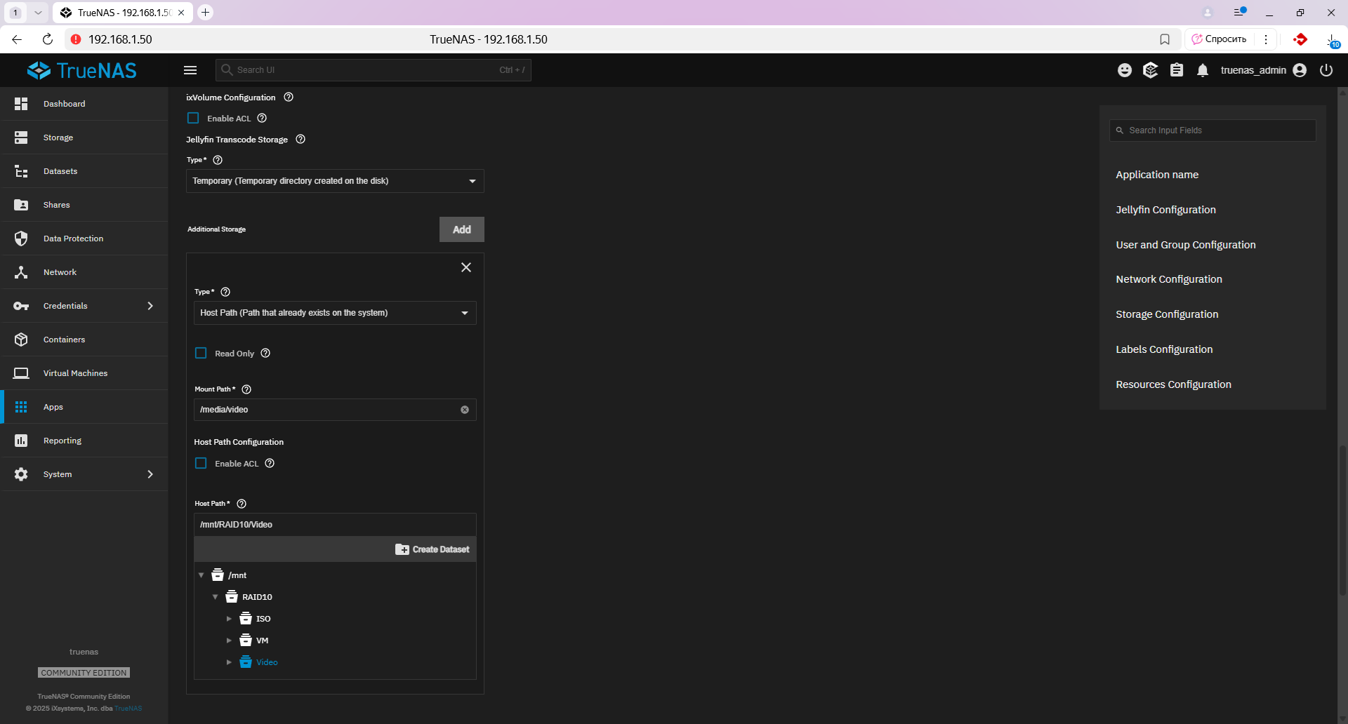 Скроллим вниз до пункта "Additional Storage". Здесь нам нужно добавить наш датасет с видосиками. Указываем тип Host Path. В Host Path указываем путь к созданному датастору Video. У него на картинке путь /mnt/RAID1/Video