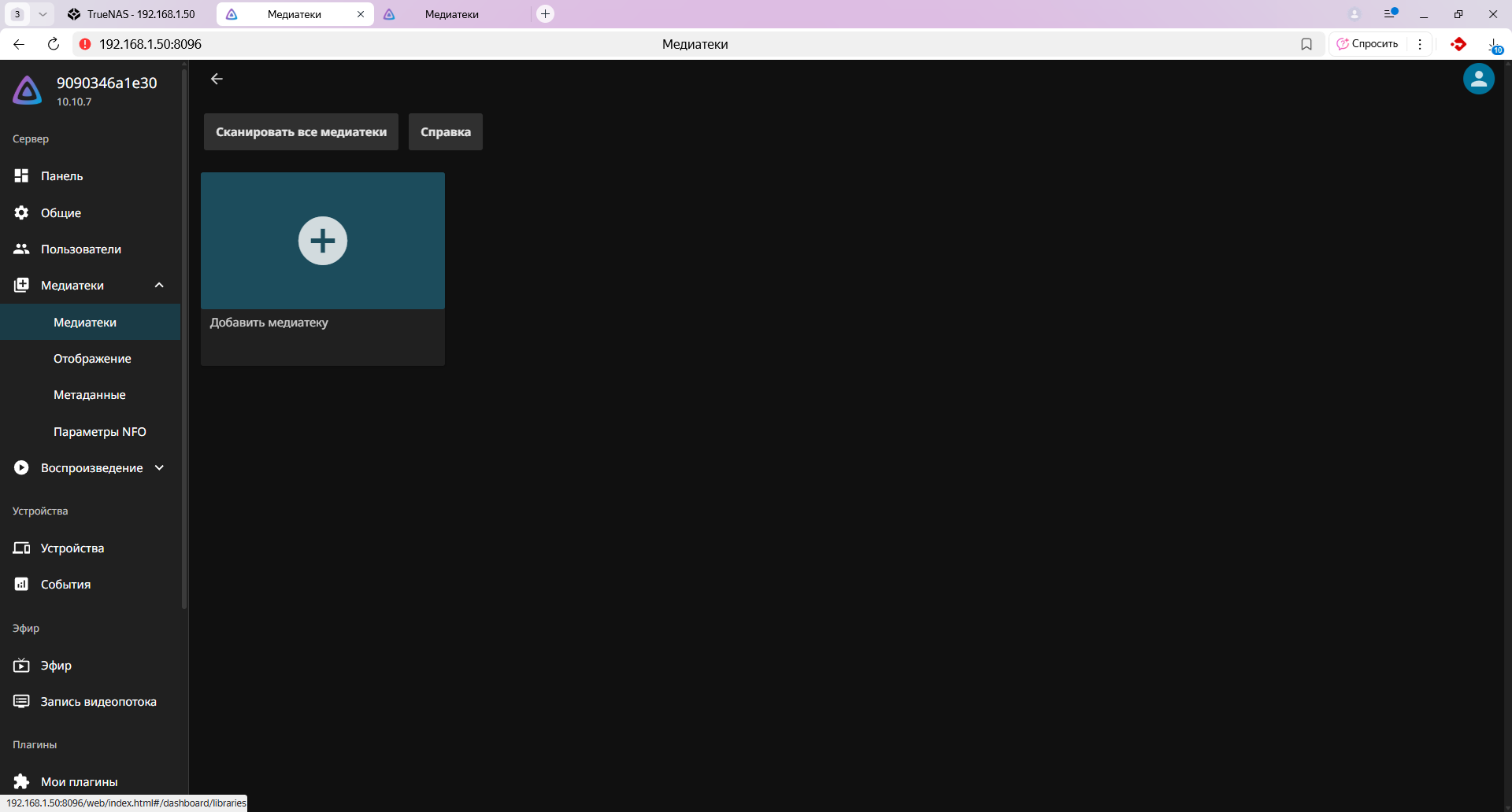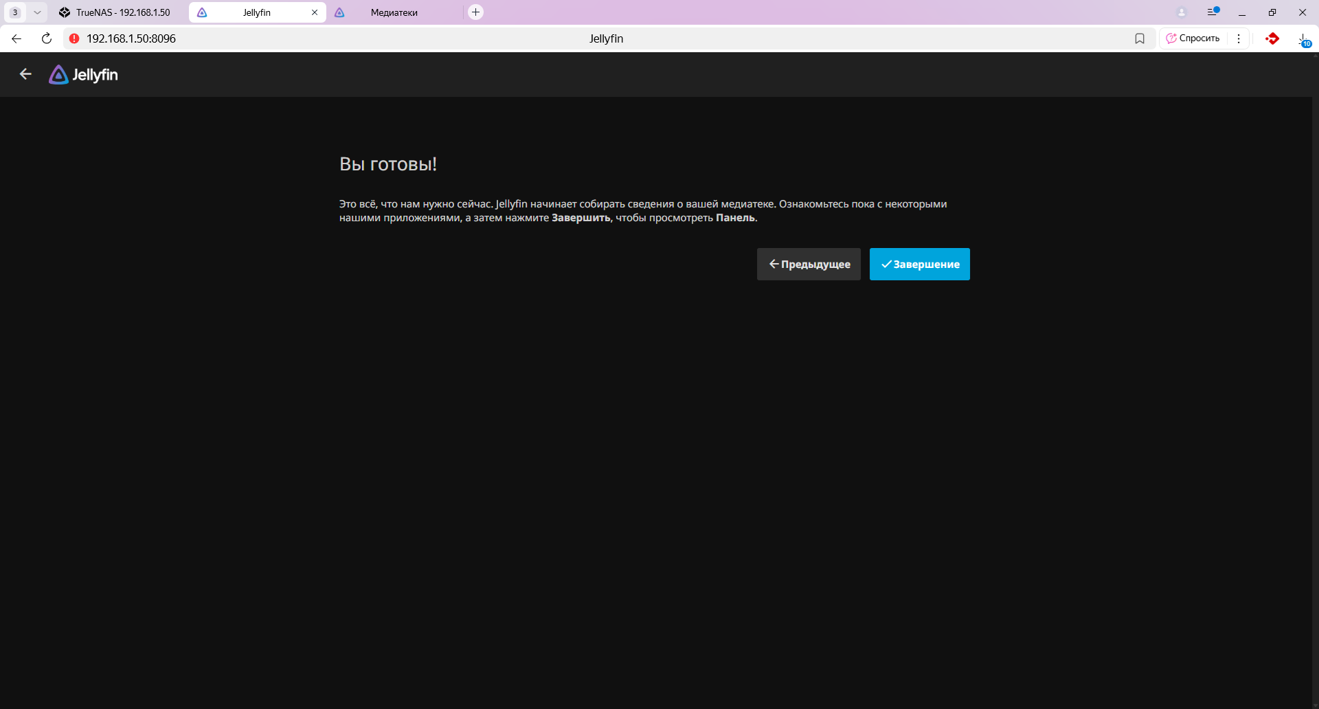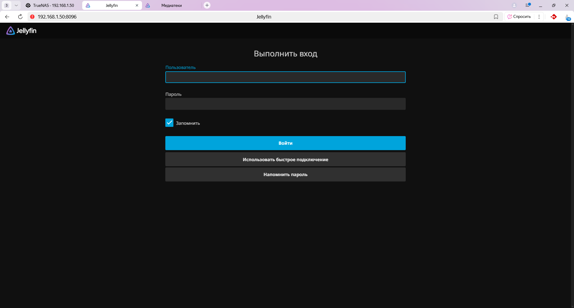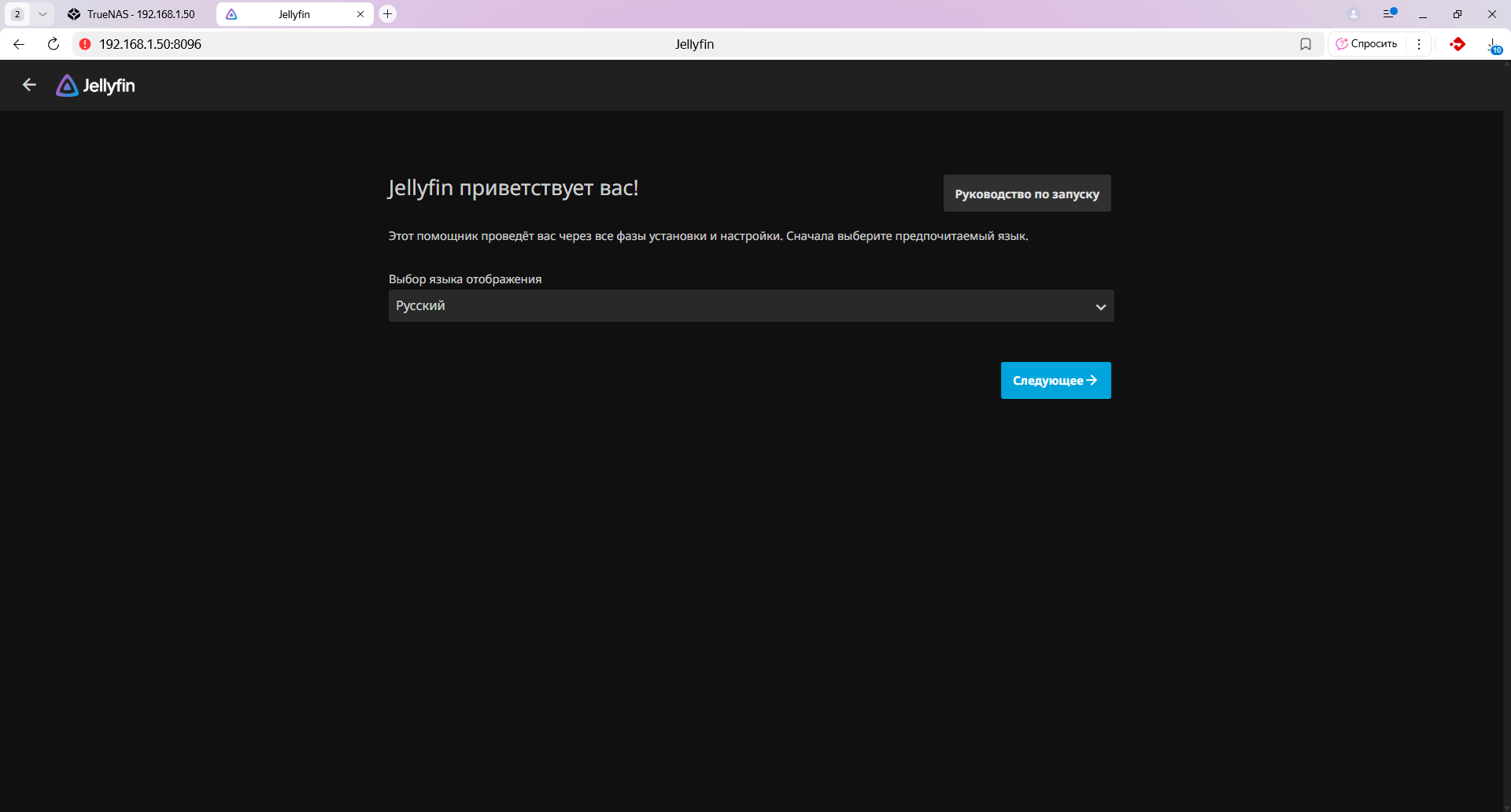 Переходим по IP адресу TrueNAS с указанным нами портом 8096.