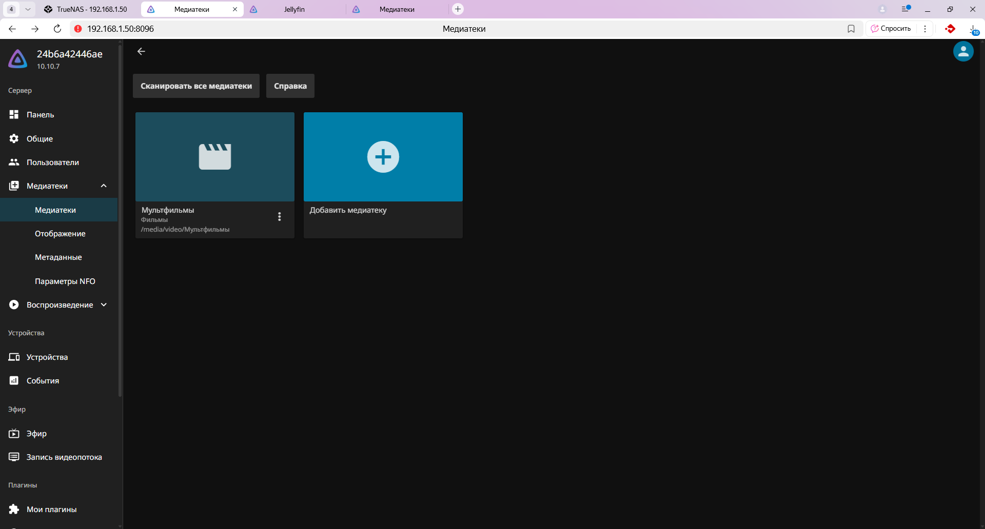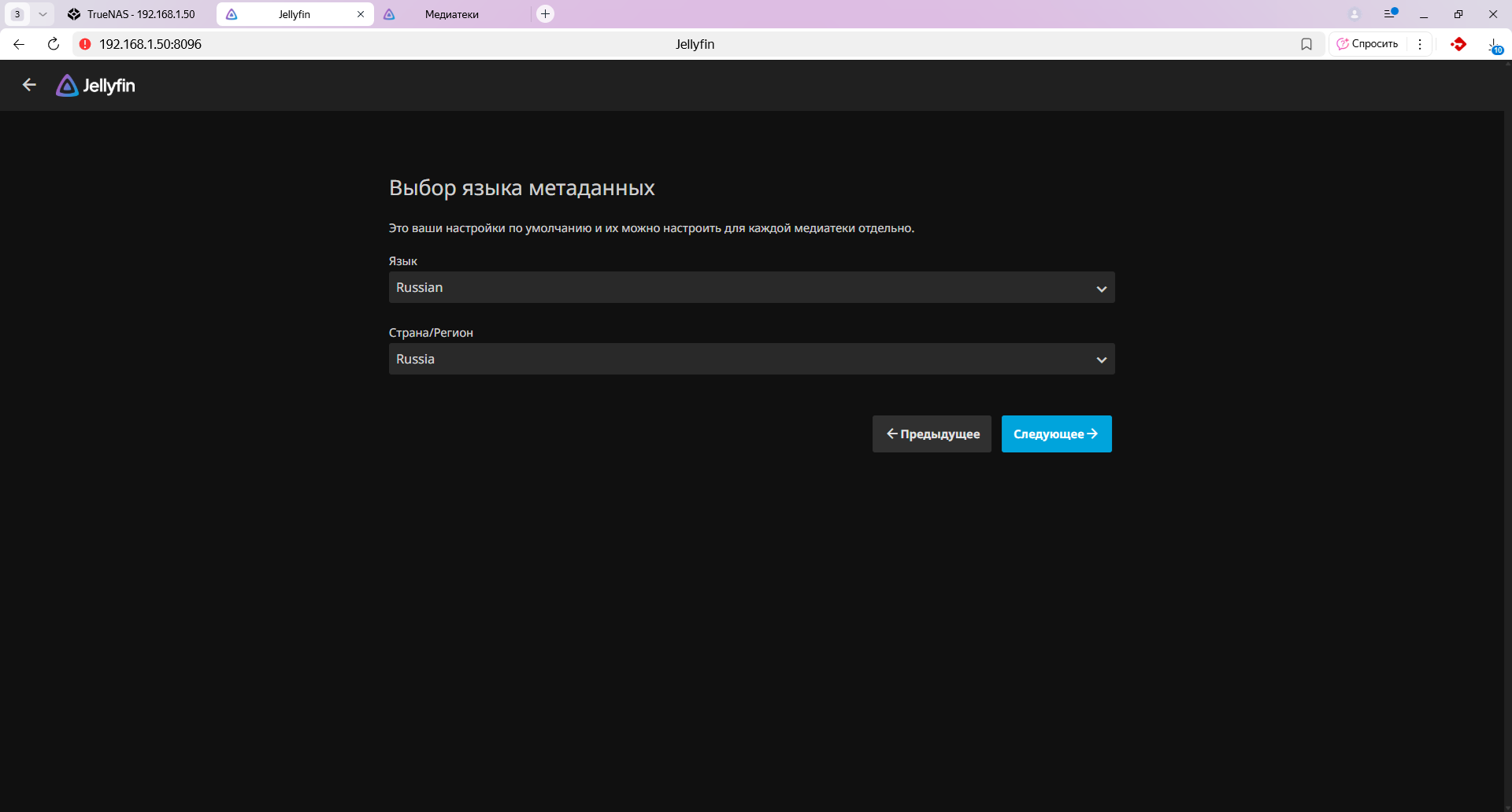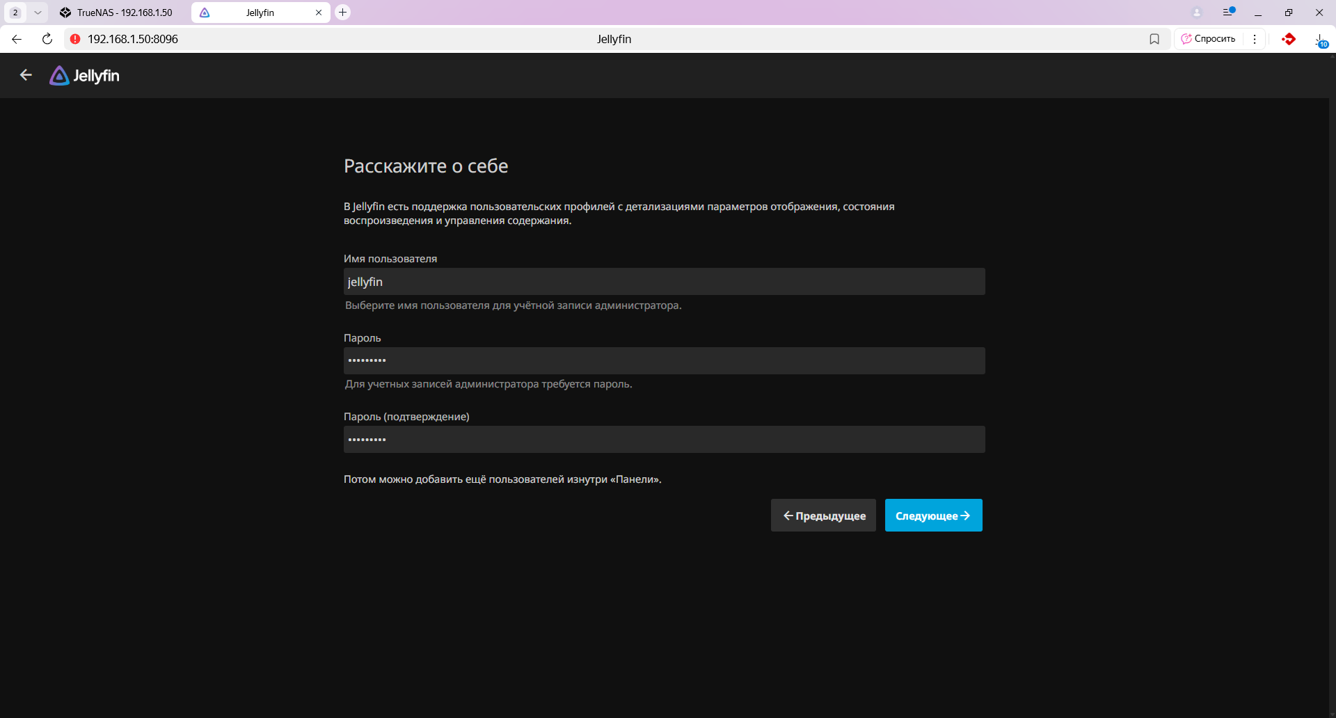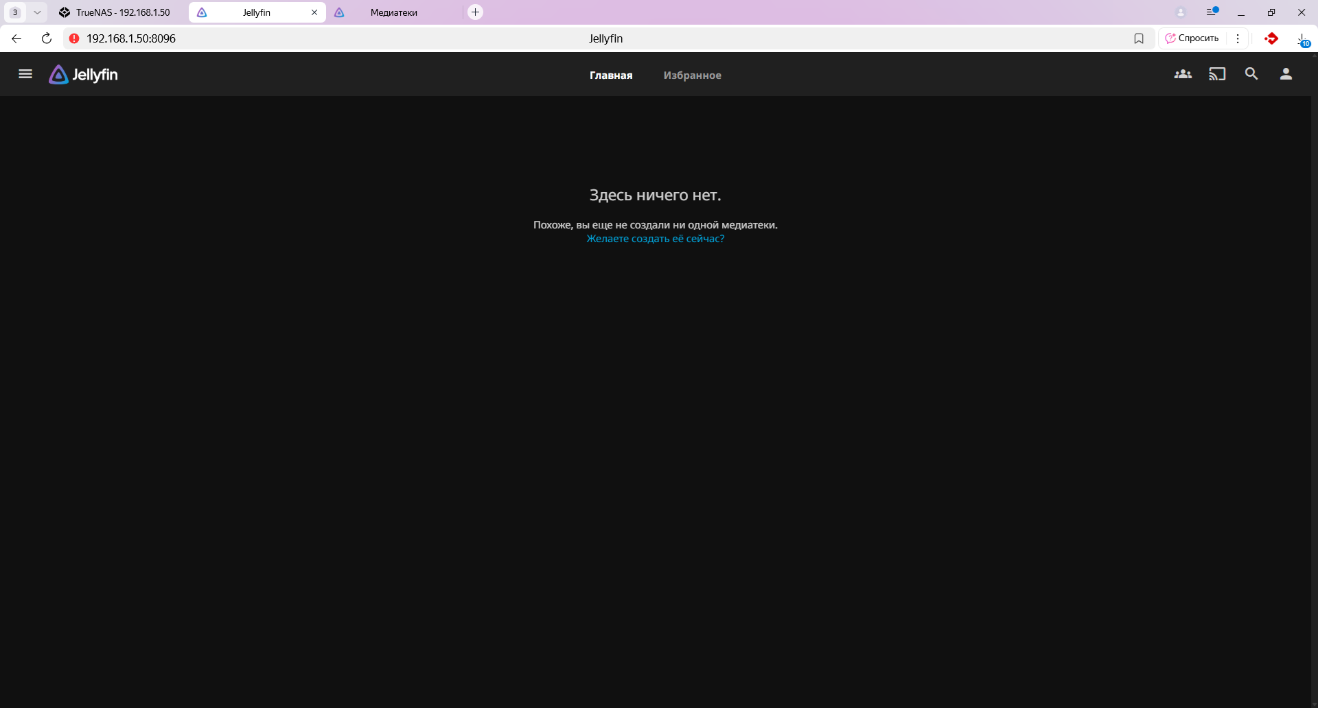 Переходим по IP адресу TrueNAS с указанным нами портом 8096.