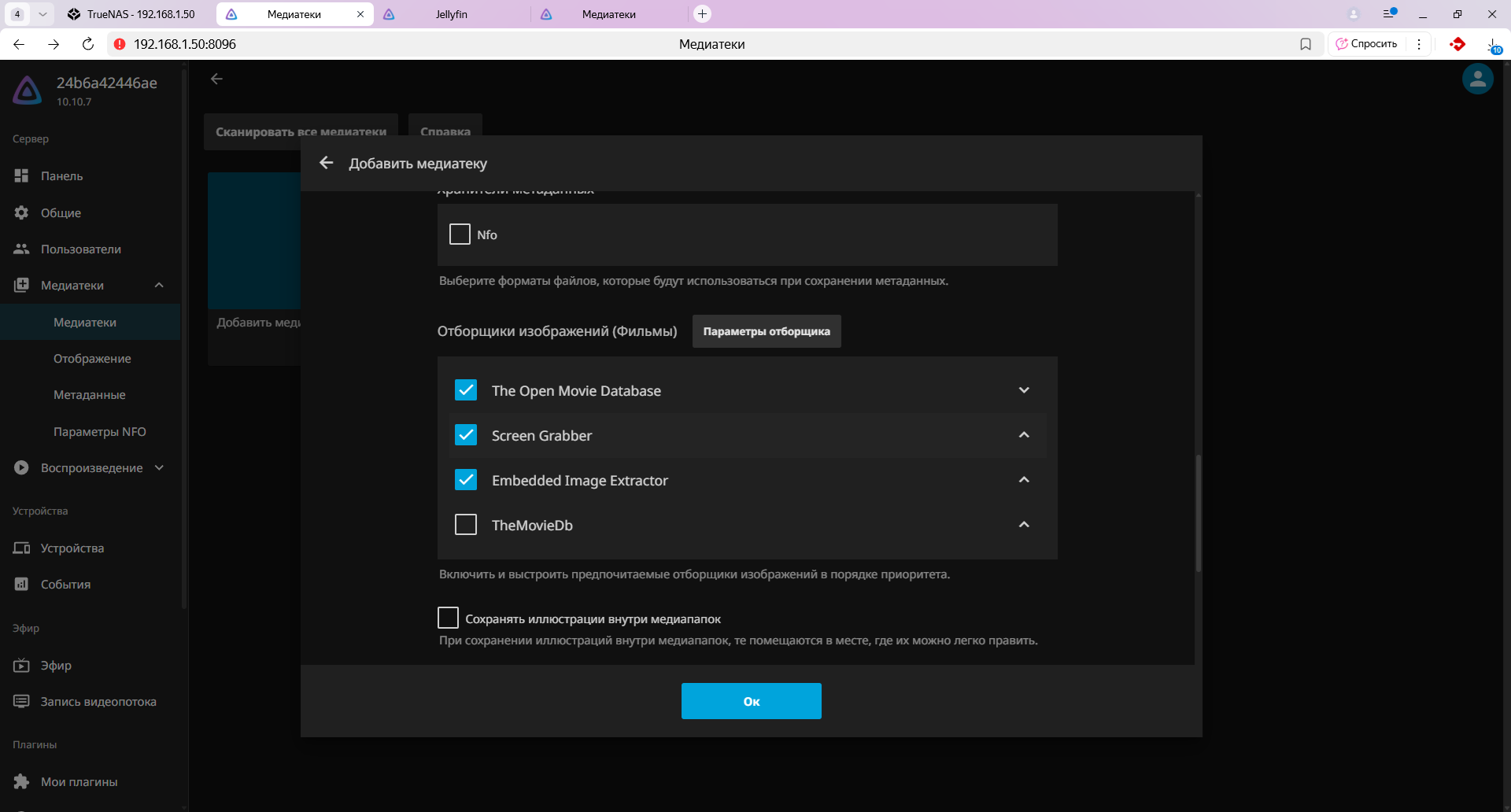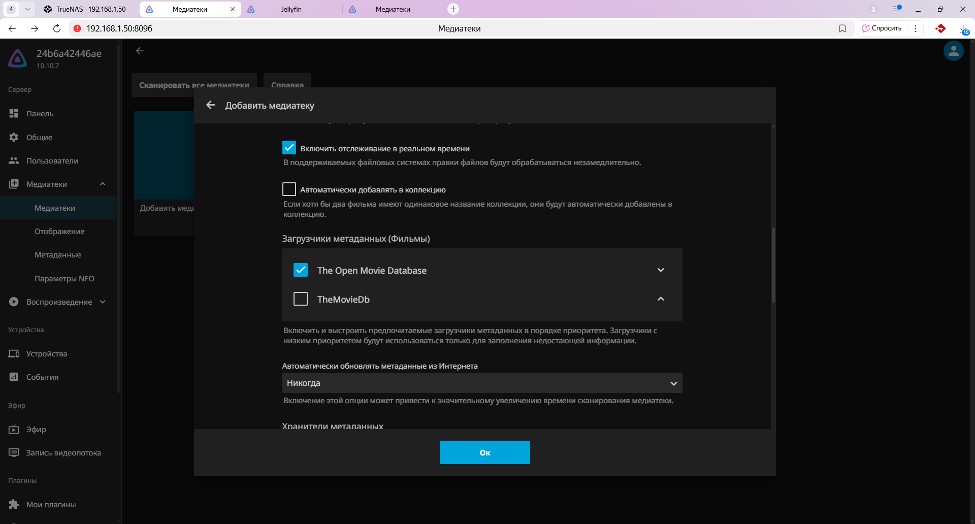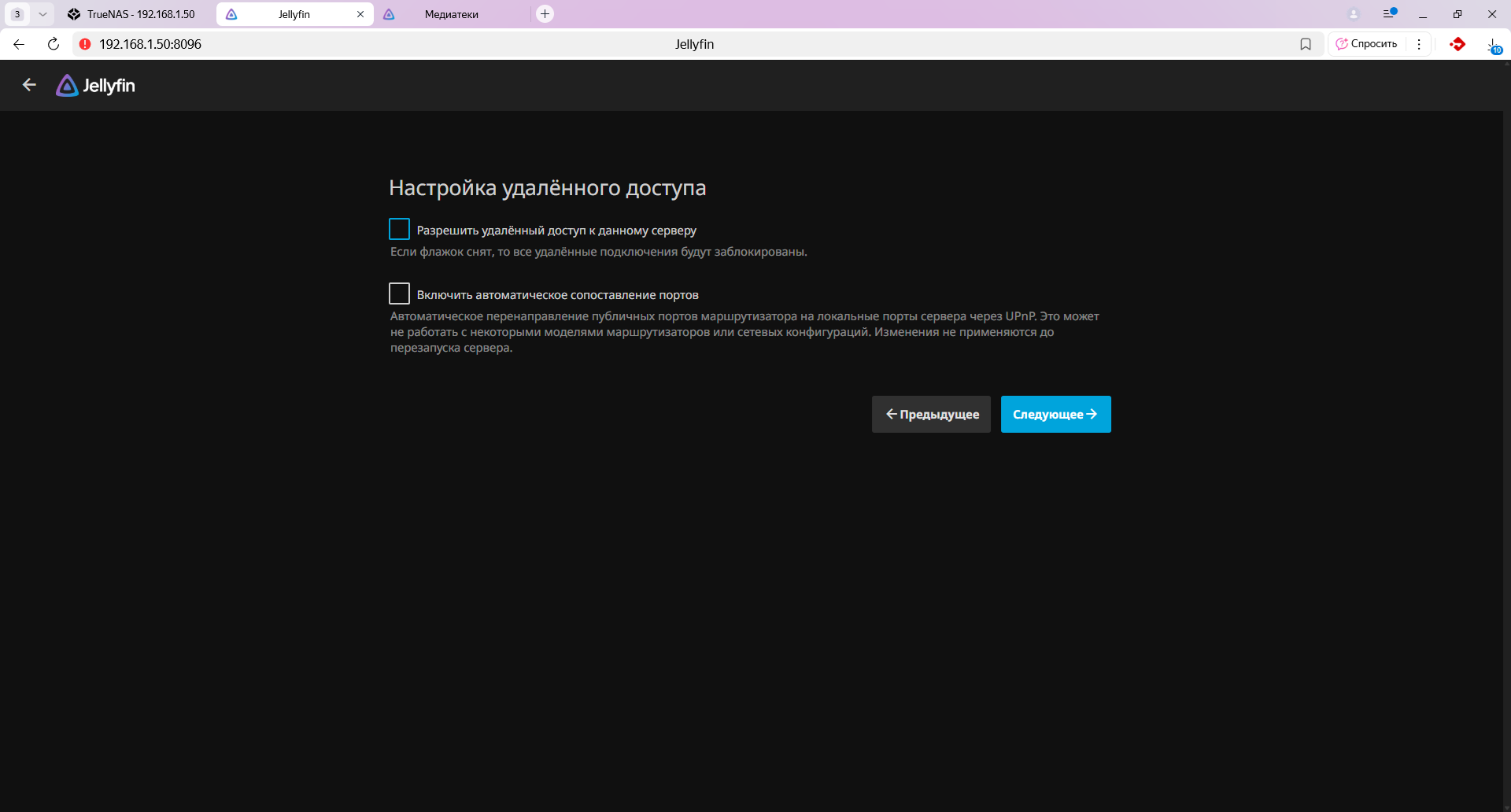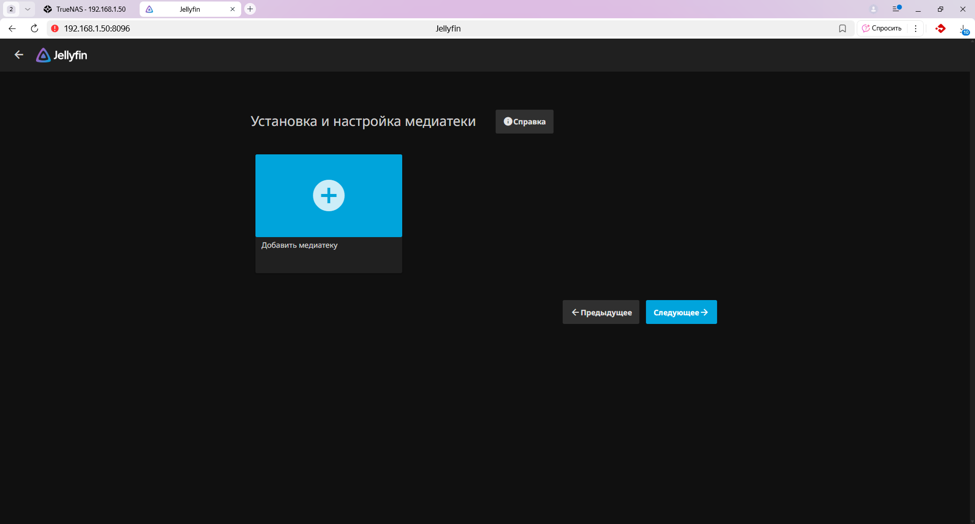 Можно было бы добавить медиатеку, однако, Jellyfin не увидит созданные ролики, прав не хватит. Права настроим позже, пропустим этот шаг. Следующее.