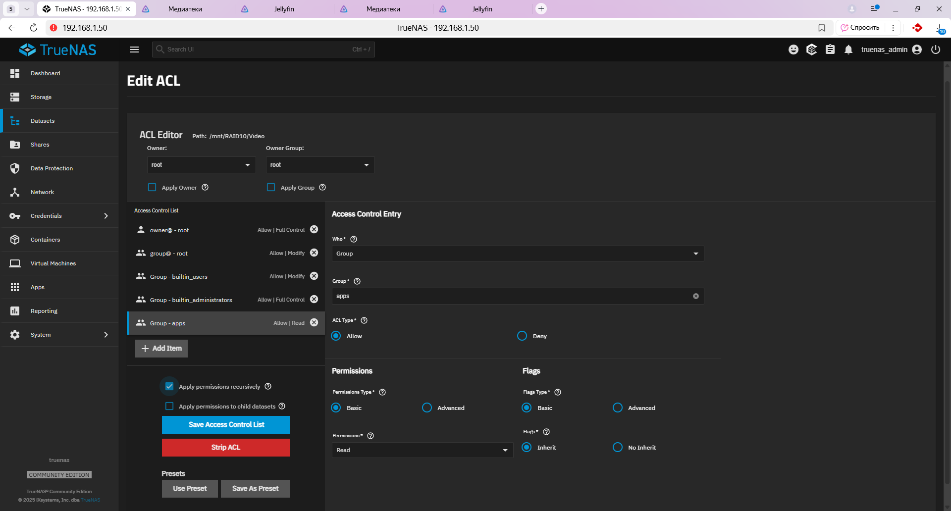 в список доступа добавляем группу apps с правами доступа на чтение. Поскольку в папке уже есть какие-то директории и файлы, ставим галку Apply permissions recursively. Save Access Control List.