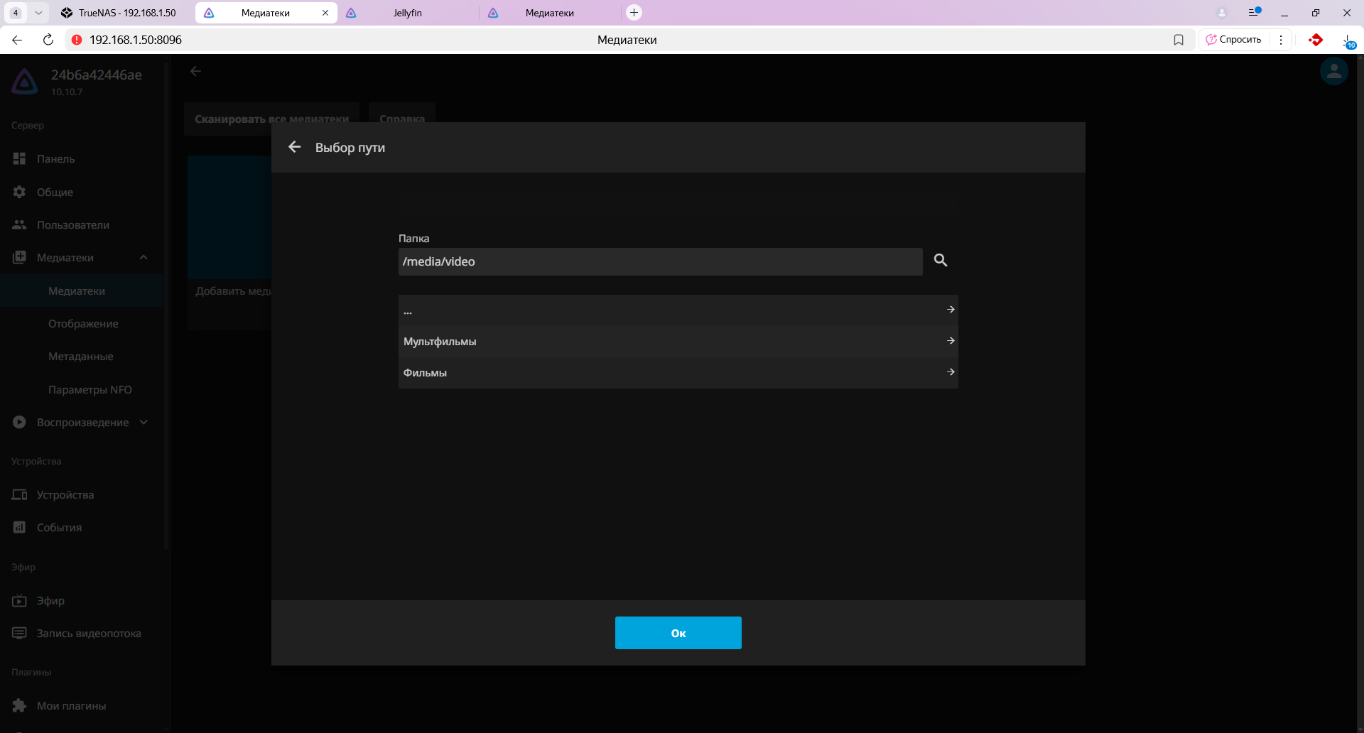 В админке Jellyfin добавляем медиатеку. Внутри /media/video стали видны созданные мной директории, выберу папку с мультфильмами. OK