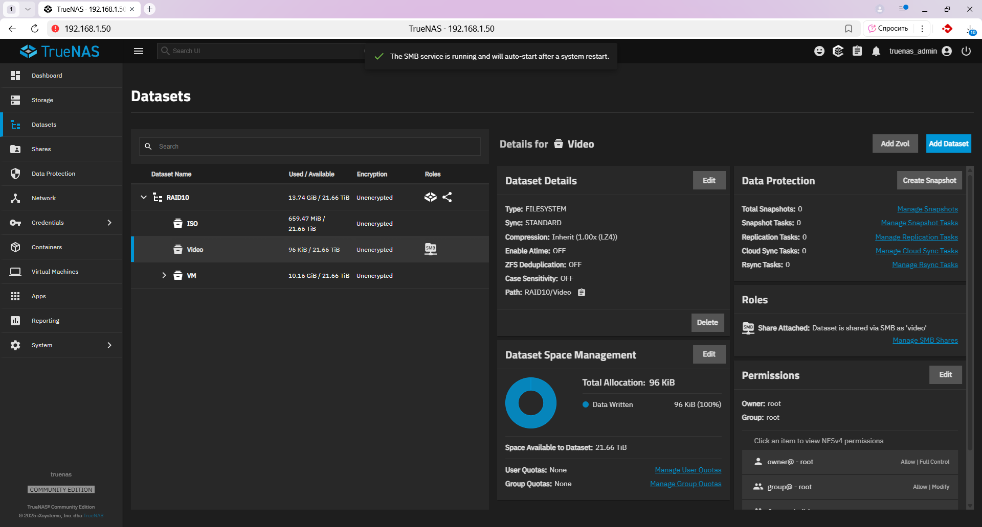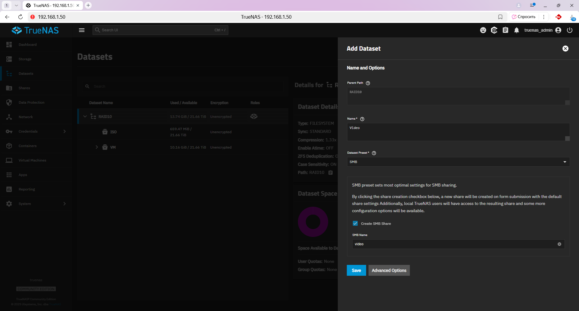 Указываем название, выбираем пресет SMB. Я собираюсь подключить к ноутбуку сетевую папку NAS по SMB и управлять фильмами через неё. Ставим галку "Create SMB Share", указываем имя сетевой папки "video". Save.