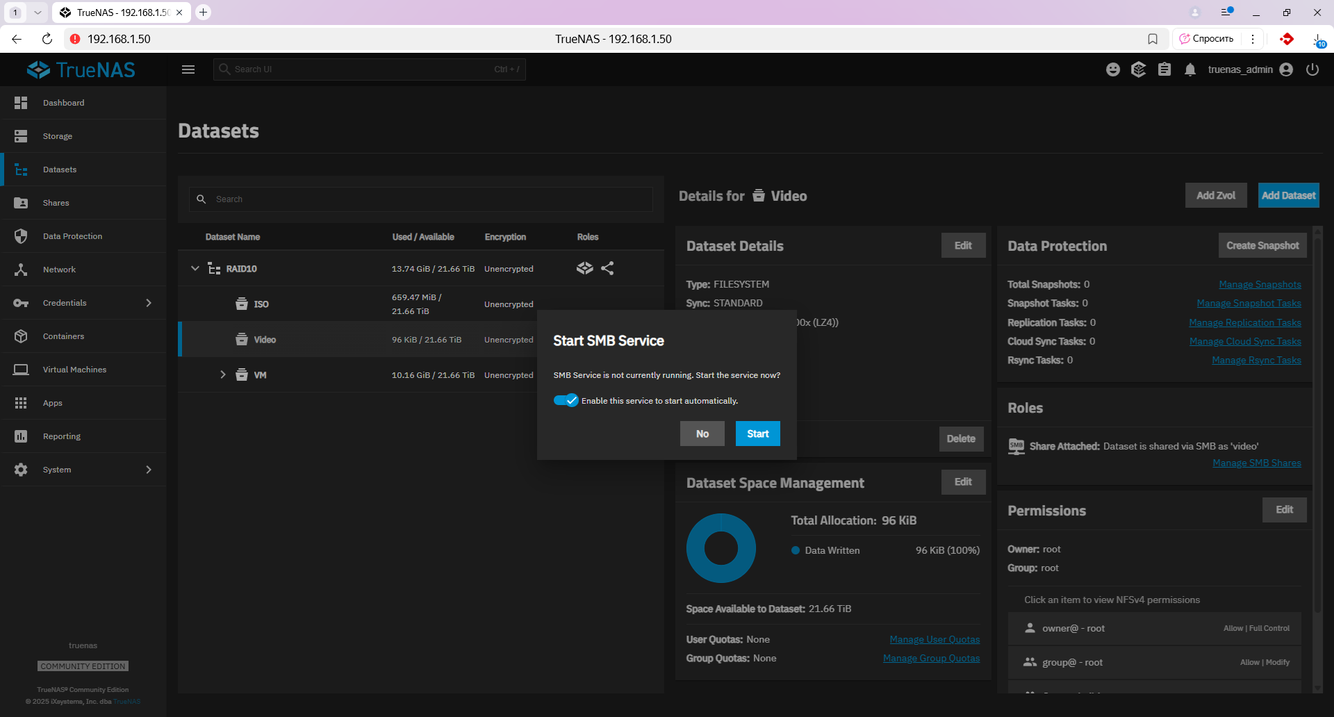 Службу SMB я ранее не использовал, включаем автостарт и запускаем её.