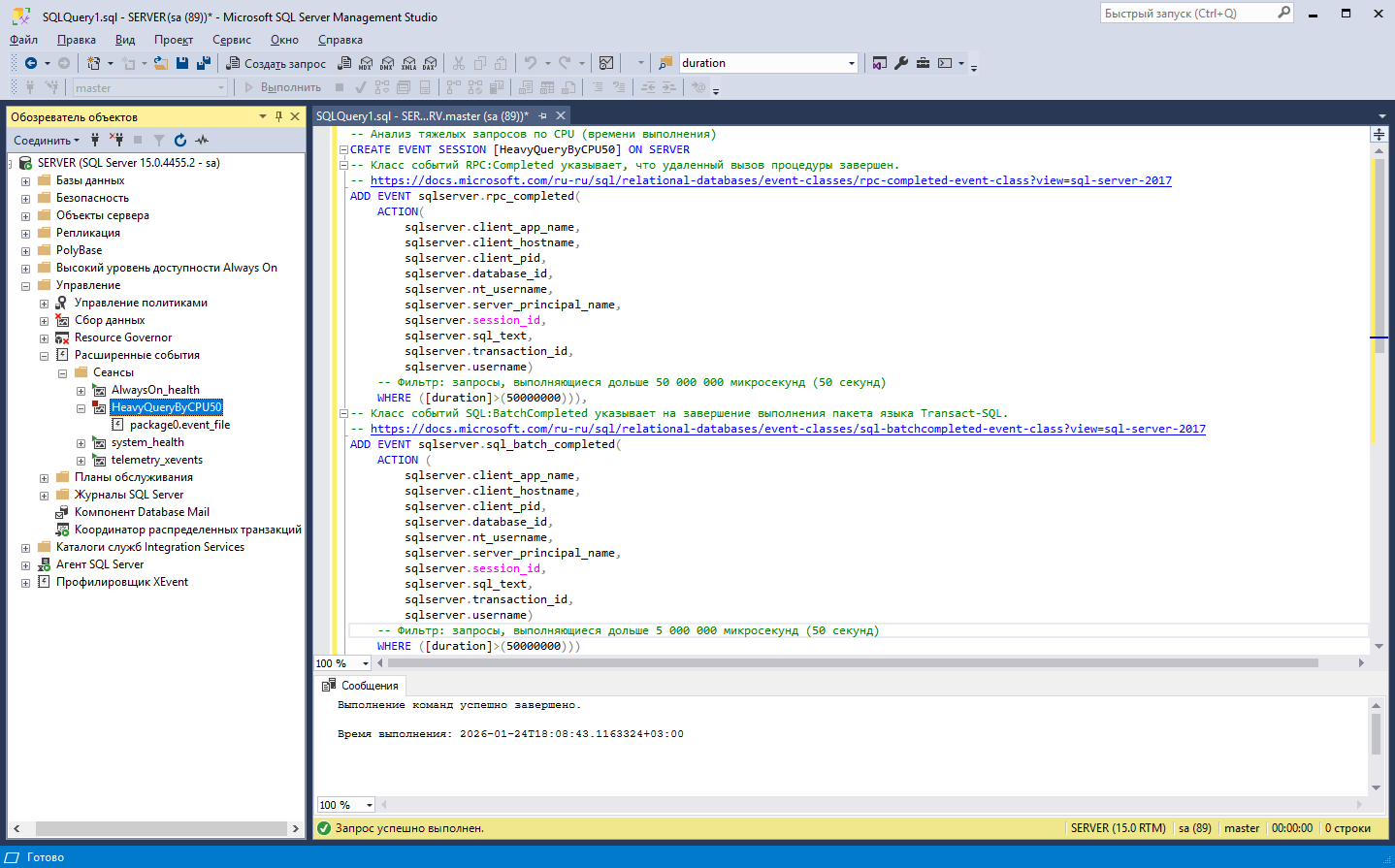 Ловить долгие запросы будем с помощью расширенных событий. Будем анализировать тяжелые запросы по CPU (времени выполнения). Сначала отловим самые долгие запросы, которые выполняются более 50 секунд. Напишем скрипт, который создает расширенное событие (Extended Event) в Microsoft SQL Server для мониторинга и сбора информации о тяжелых запросах, которые выполняются долгое время и потребляют значительные ресурсы CPU.