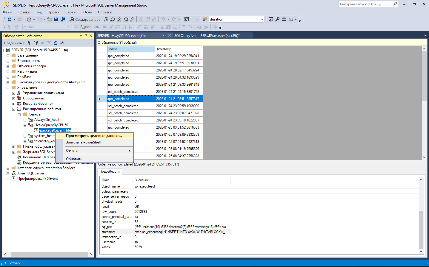 ALTER EVENT SESSION [HeavyQueryByCPU50] ON SERVER STATE = STOP;Или правой кнопкой — Остановить сеанс.