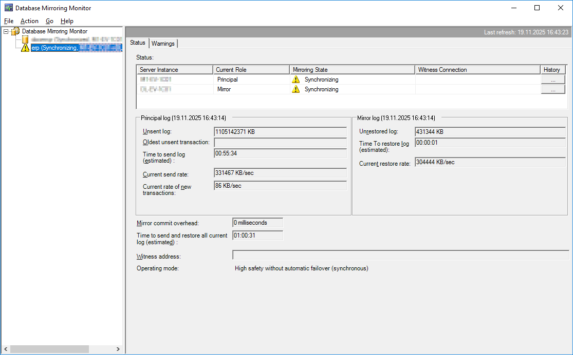 Часто бывает так, что после каких-то действий по обновлению или из-за перезагрузки сервера процесс зеркалирование базы может приостановиться. База висит в статусе SUSPENDED.