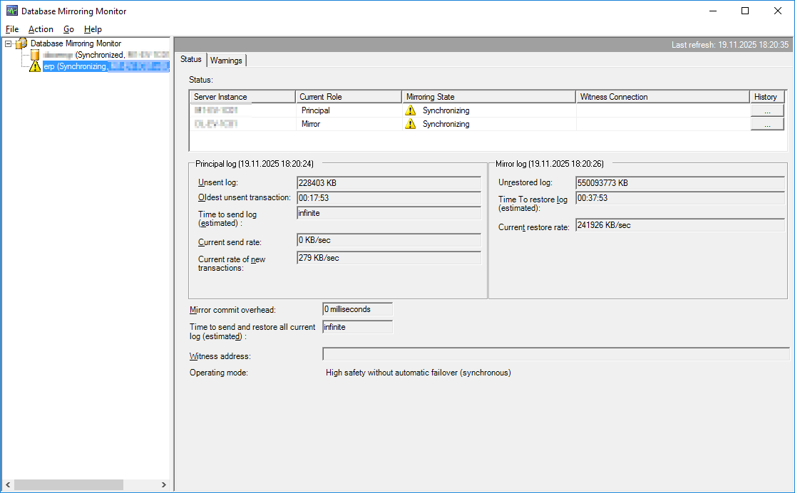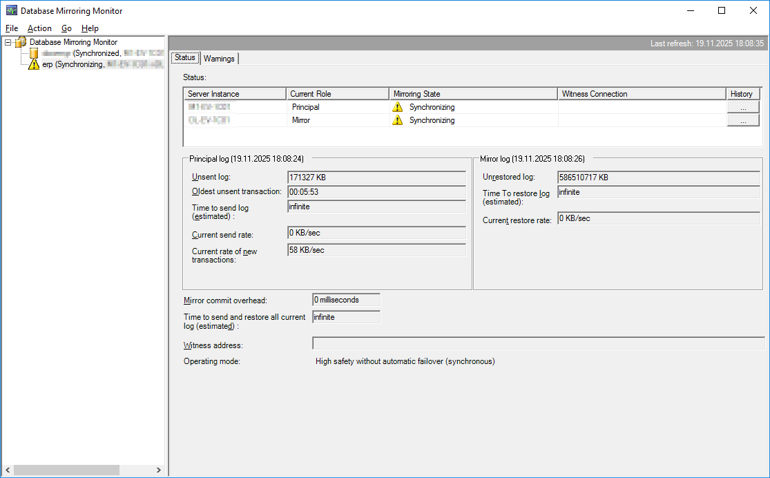 ALTER DATABASE [имя_вашей_бд] SET PARTNER RESUMEОднако, как показывает практика, это не всегда работает. База переводится в режим SYNCHRONIZED, при этом ничего не происходит. Database Mirroring Monitor показывает, что данные не передаются.