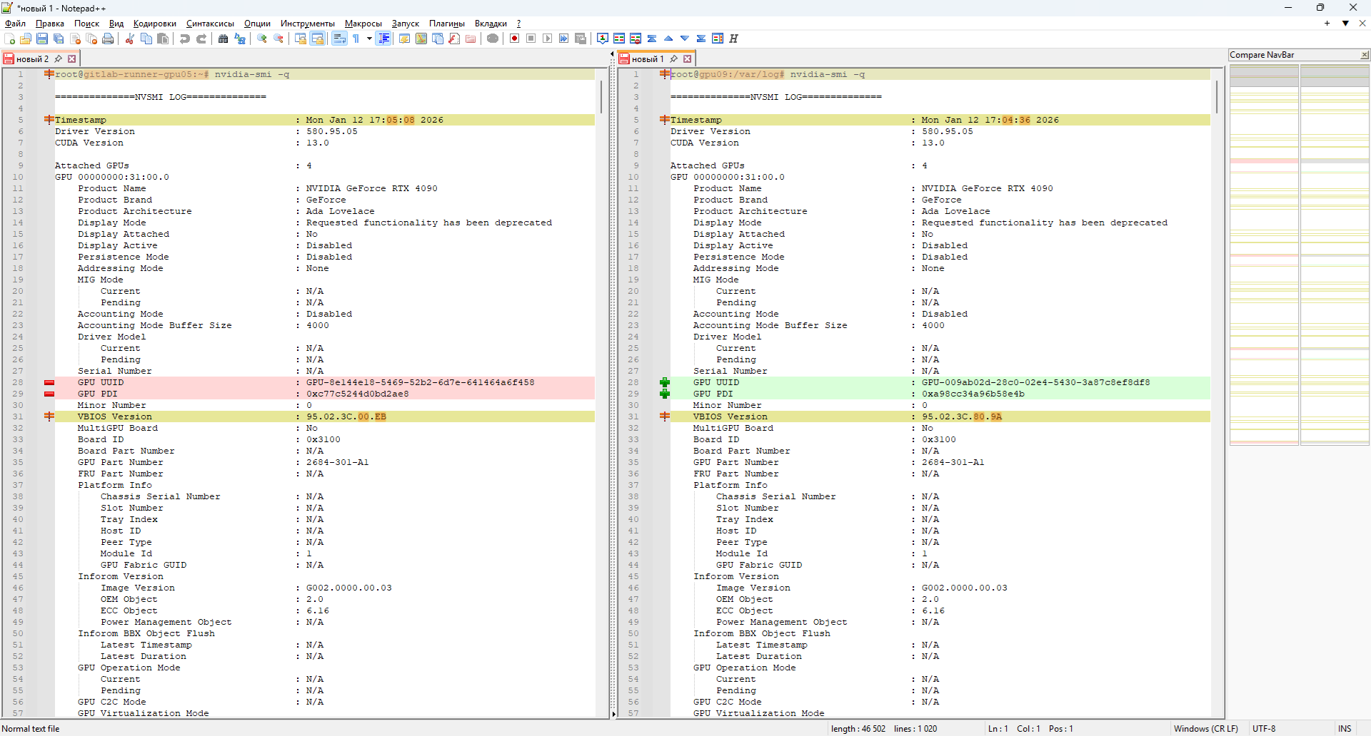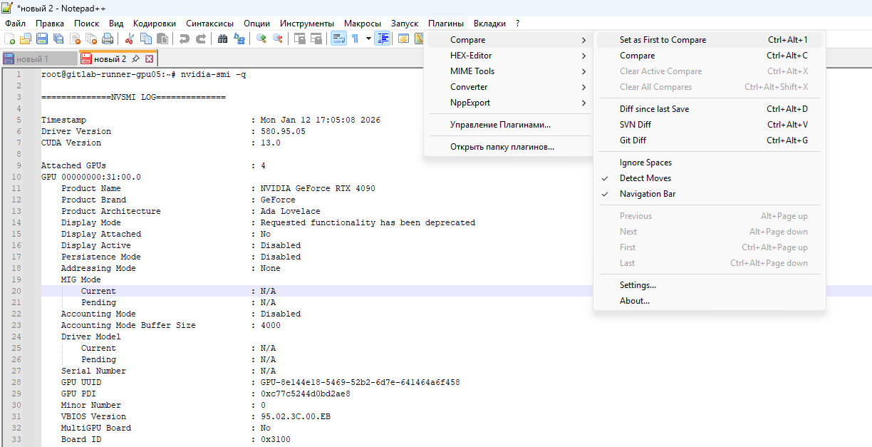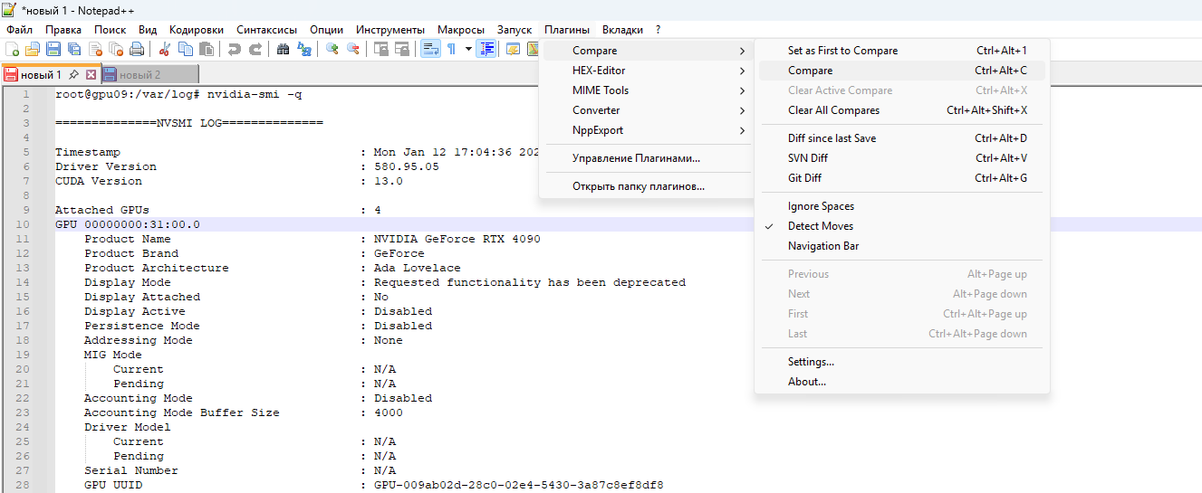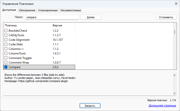 Выбираем второй сравниваемый файл, кликаем по названию его вкладки. Плагины → Compare → Compare или Ctrl+Alt+C.