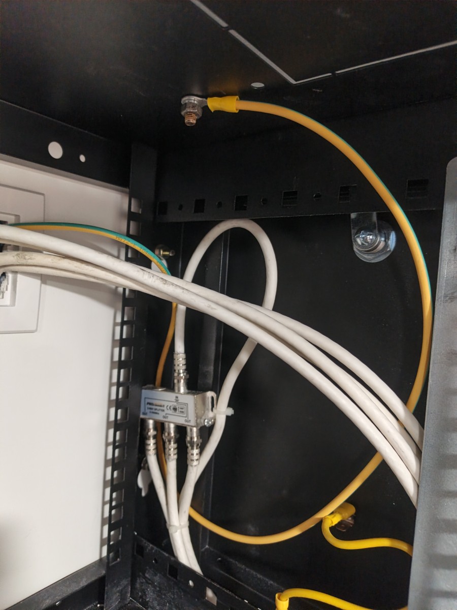 Здесь же выведены коаксиальные телевизионные кабели. Подключил их через тройник и убрал в сторонку.