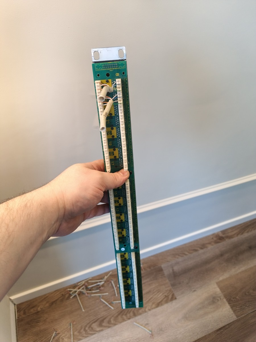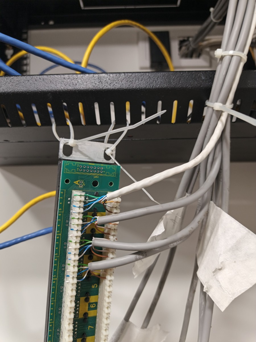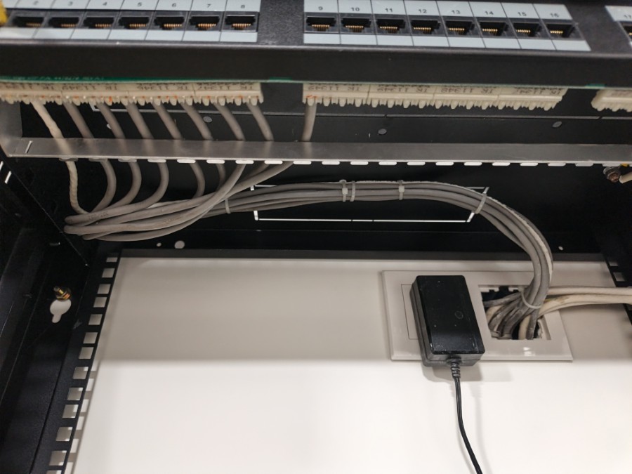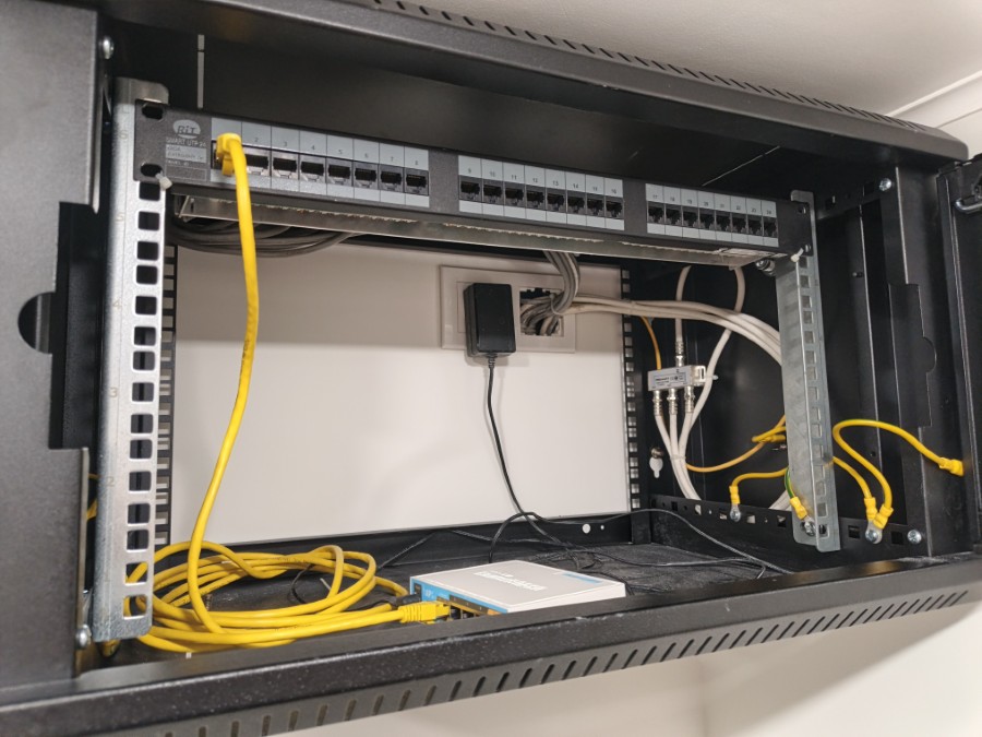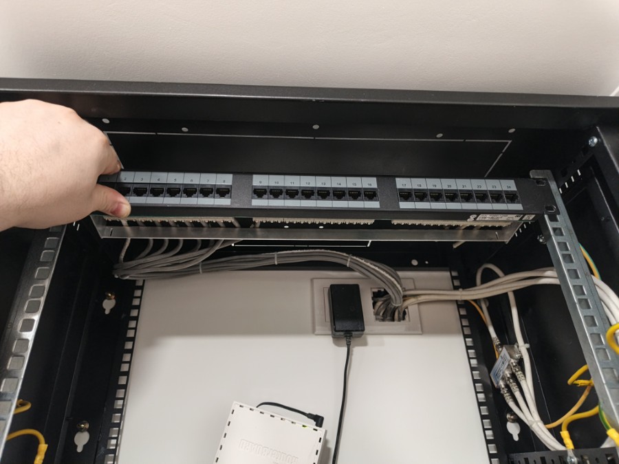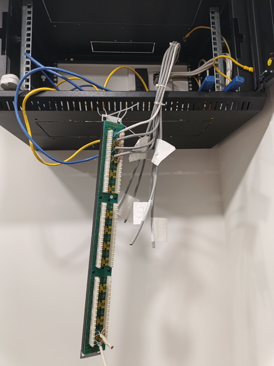 Временно фиксирую патч-панель на стяжки. Болты с собой не взял, потом закреплю правильно.