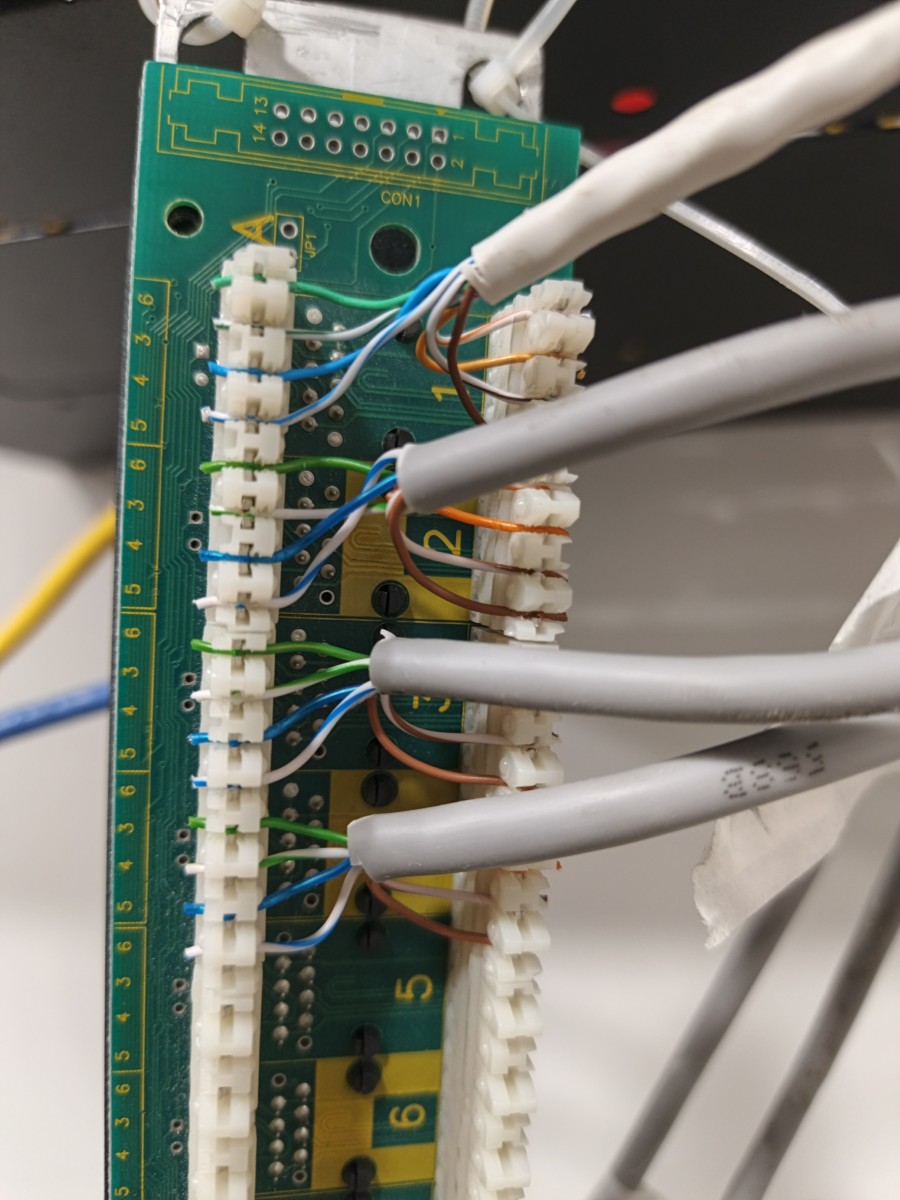 Сама процедура не сложная, просто неудобно, патч-панель висит в воздухе. Временно прикрепил её стяжками к корпусу шкафа. Защёлкиваем провода, соблюдая "цветовую дифференциацию штанов". Благо порядок жил нарисован на патч-панели.