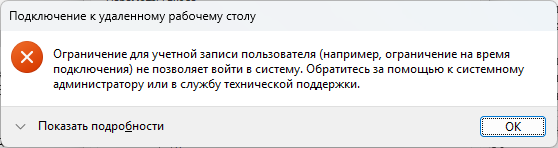 Ограничение для учётной записи пользователя (например, ограничение на время подключения) не позволяет войти в систему. Обратитесь за помощь к системному администратору или в службу технической поддержки.