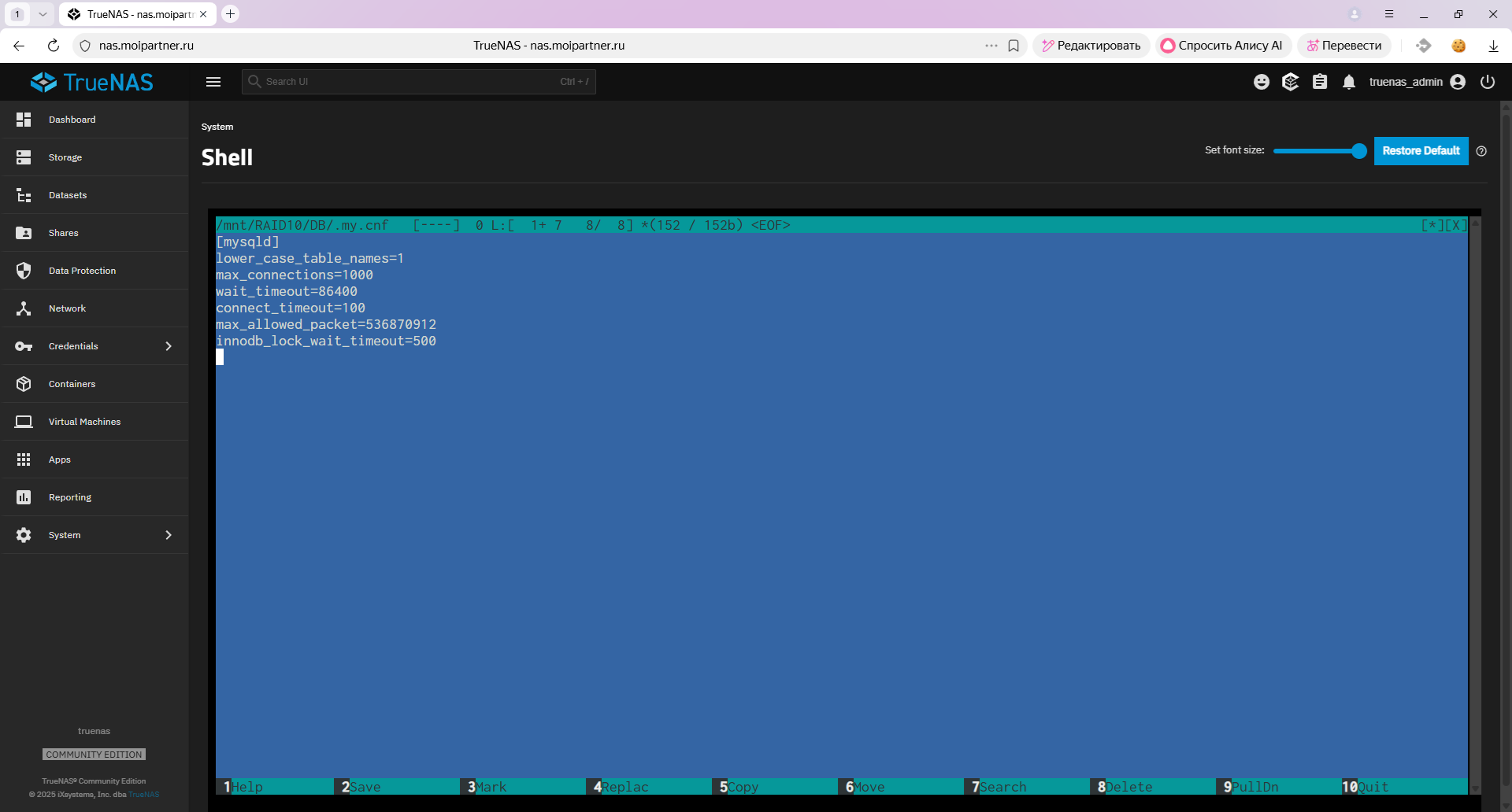 MariaDB — настройка конфигурационных параметров в TrueNAS
