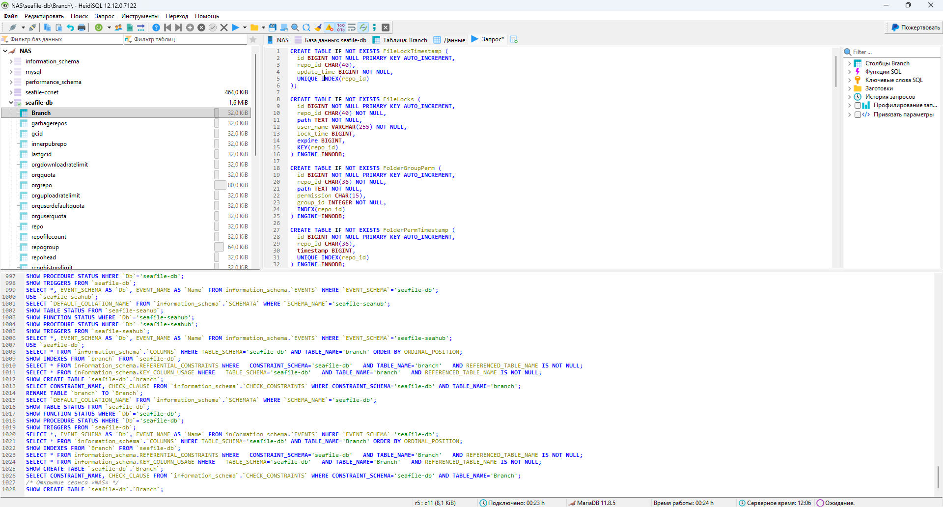 У меня Seafile работает с версии 6. Постепенно апгрейды довели домашнее хранилище до 12 версии. Однако, всё чаще натыкаюсь на проблемы, связанные с отсутствуем таблиц.