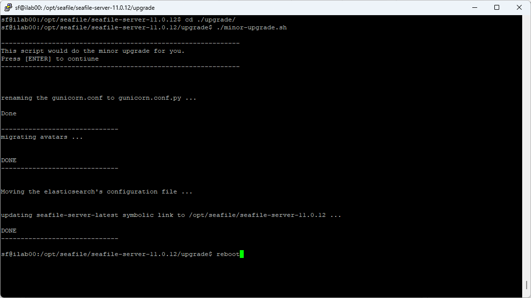 Для обновления Seafile Server с версии 11.0.6 до версии 11.0.12 нужно использовать скрипт minor-upgrade.sh.