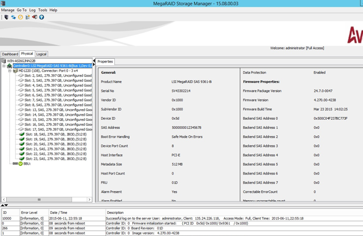 The Logical view shows the hierarchy of controllers, virtual drives, and the drives and drive groups that make up the virtual drives. When multiple controllers are connected, they are sorted based on the bus device function. The controllers are indexed with 0, 1, 2, and so on. The properties for these components appear in the right panel.