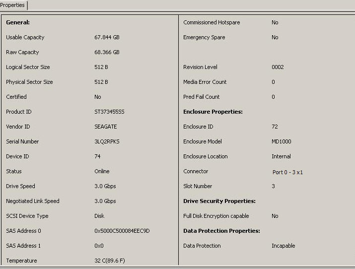 The Emergency Spare property determines whether a particular drive is capable of becoming an emergency spare. This property is displayed under the controller properties only if the Global spare for emergency and the Unconfigured Good for emergency controller properties are enabled.