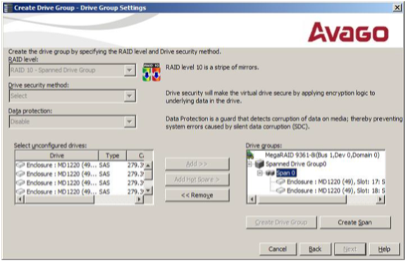 Select the RAID level desired for the drive group from the drop-down menu. To make a spanned drive, select RAID 10, RAID 50, or RAID 60 in the RAID level field.