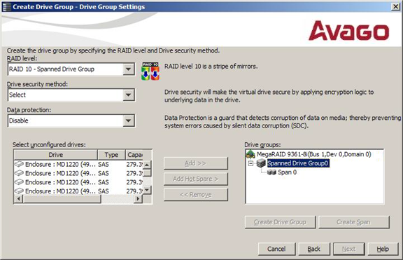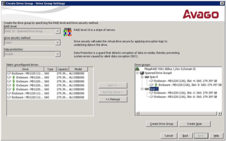 The selected drives appear under Span 0 below Drive Group 0, as shown in the following figure.