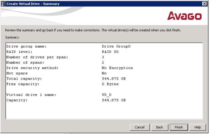 The Create Virtual Drive - Summary window appears, as shown in the following figure. This window shows the selections you made for advanced configuration.