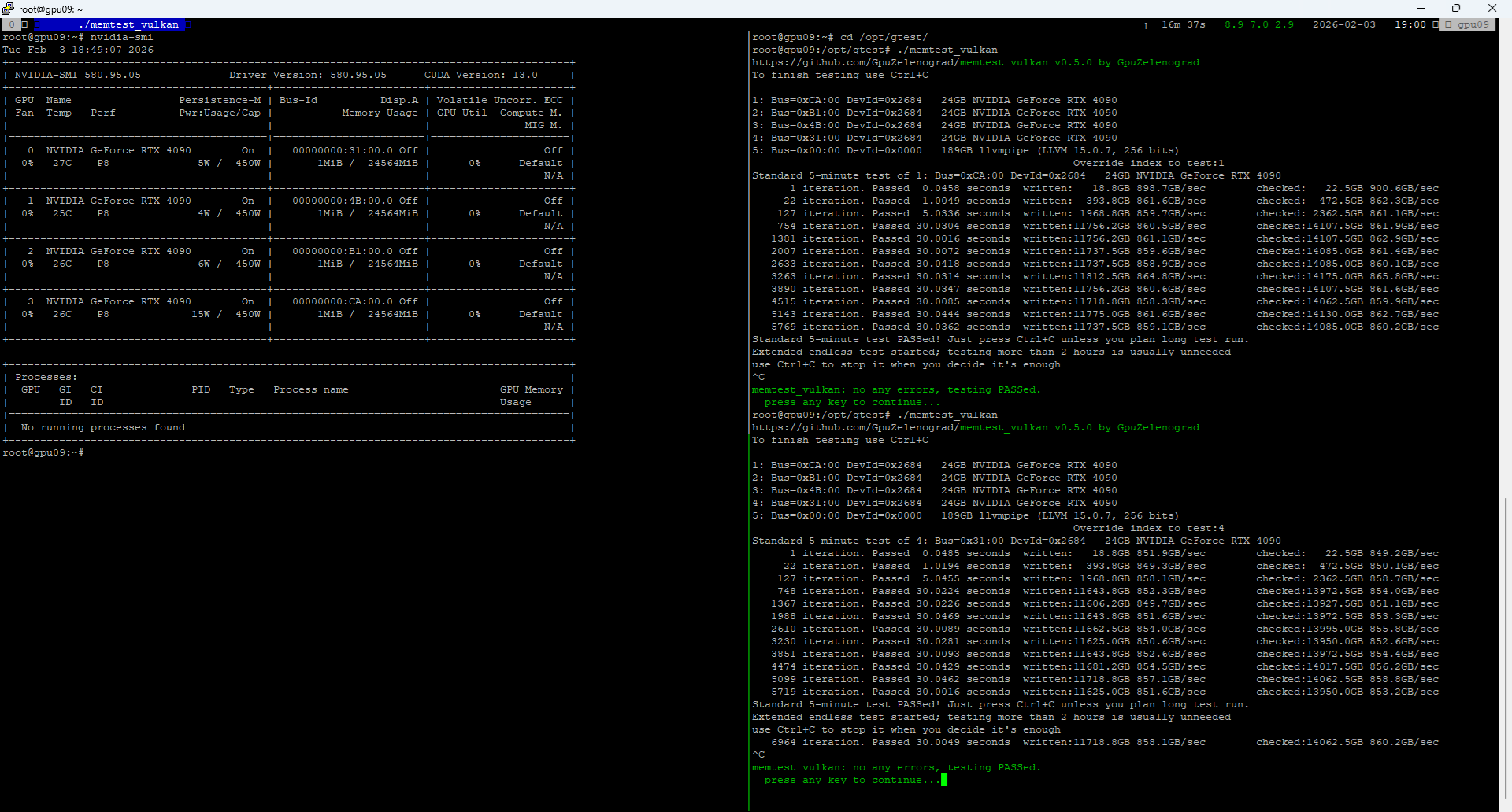 ./memtest_vulkanЕсли ничего не трогать, то выберется по умолчанию первая видеокарта. Можно указать нужный номер, при этом обращайте внимание на адрес устройства, он может не совпадать с идентификатором в nvidia-smi.