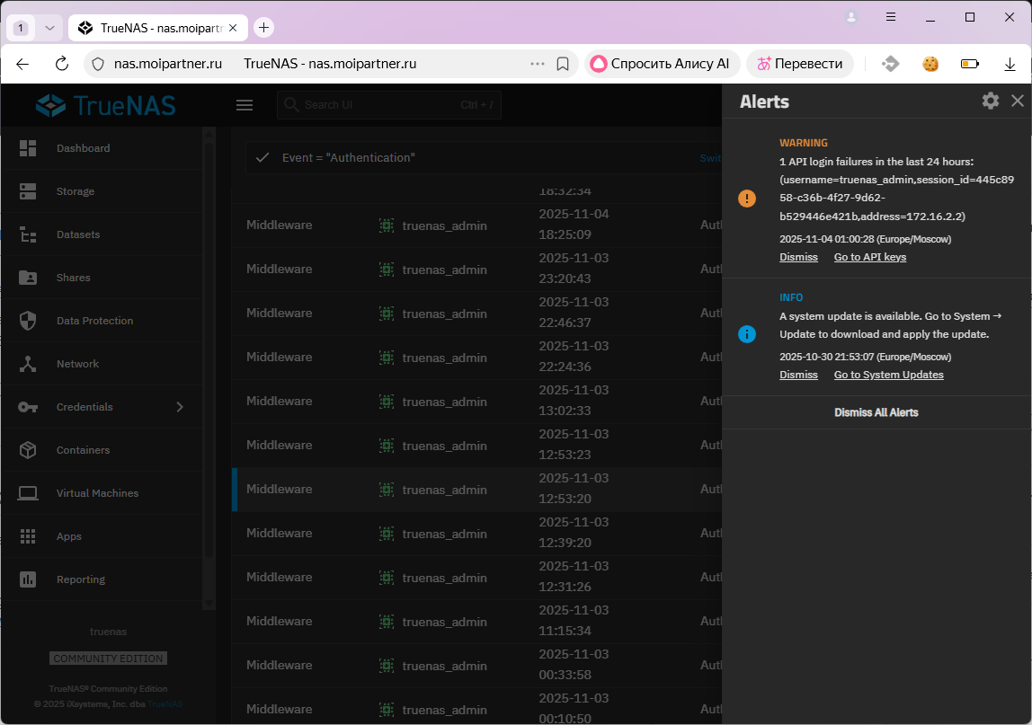 Анализирую дальше. 172.16.2.2 — это адрес Nginx Proxy Manager, который я, в том числе, использую и для аутентификации в TrueNAS. Значит, обращение было через этот прокси.