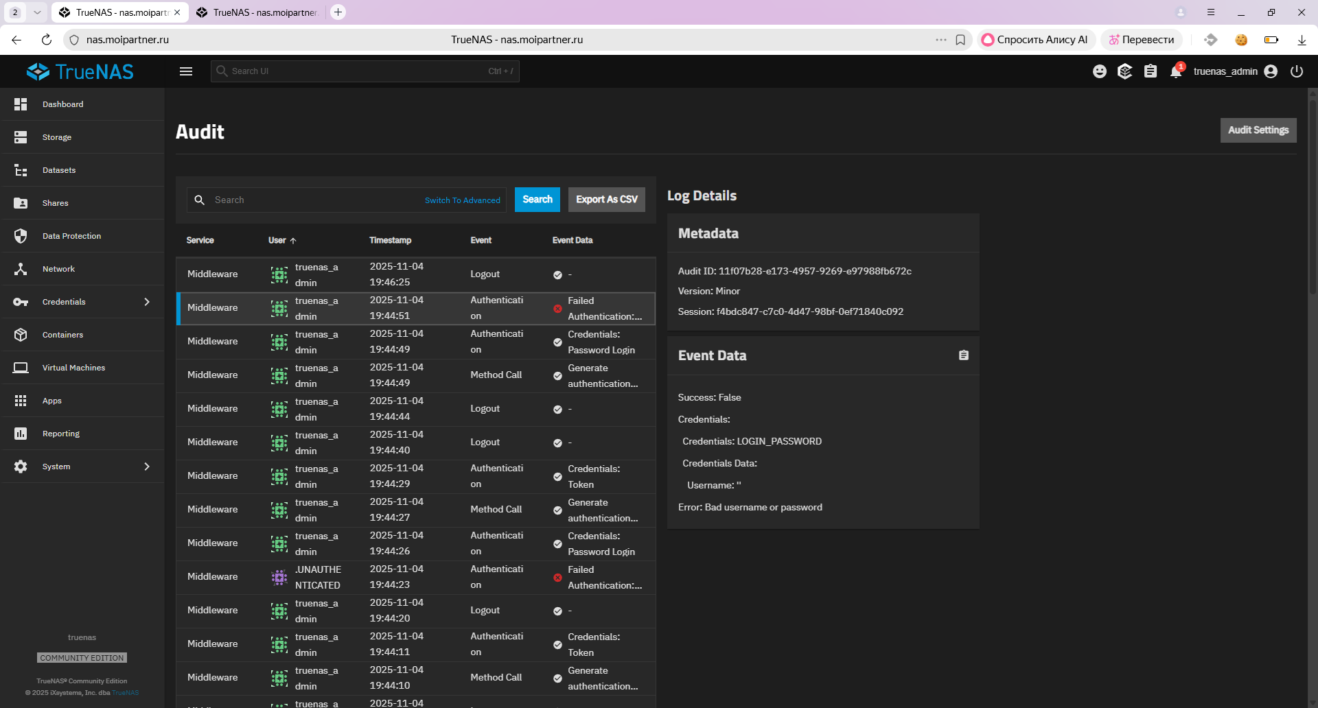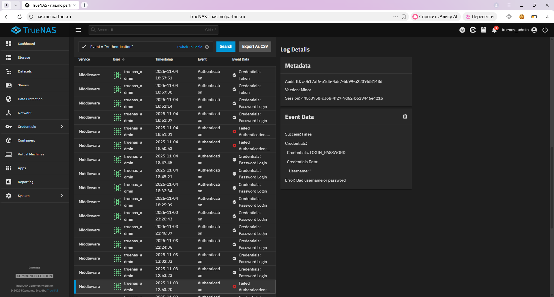 Для начала вышел из TrueNAS и попытался зайти без имени пользователя. Ошибка зафиксировалась, однако, от имени неизвестного пользователя ".UNAUTHENTICATED".
