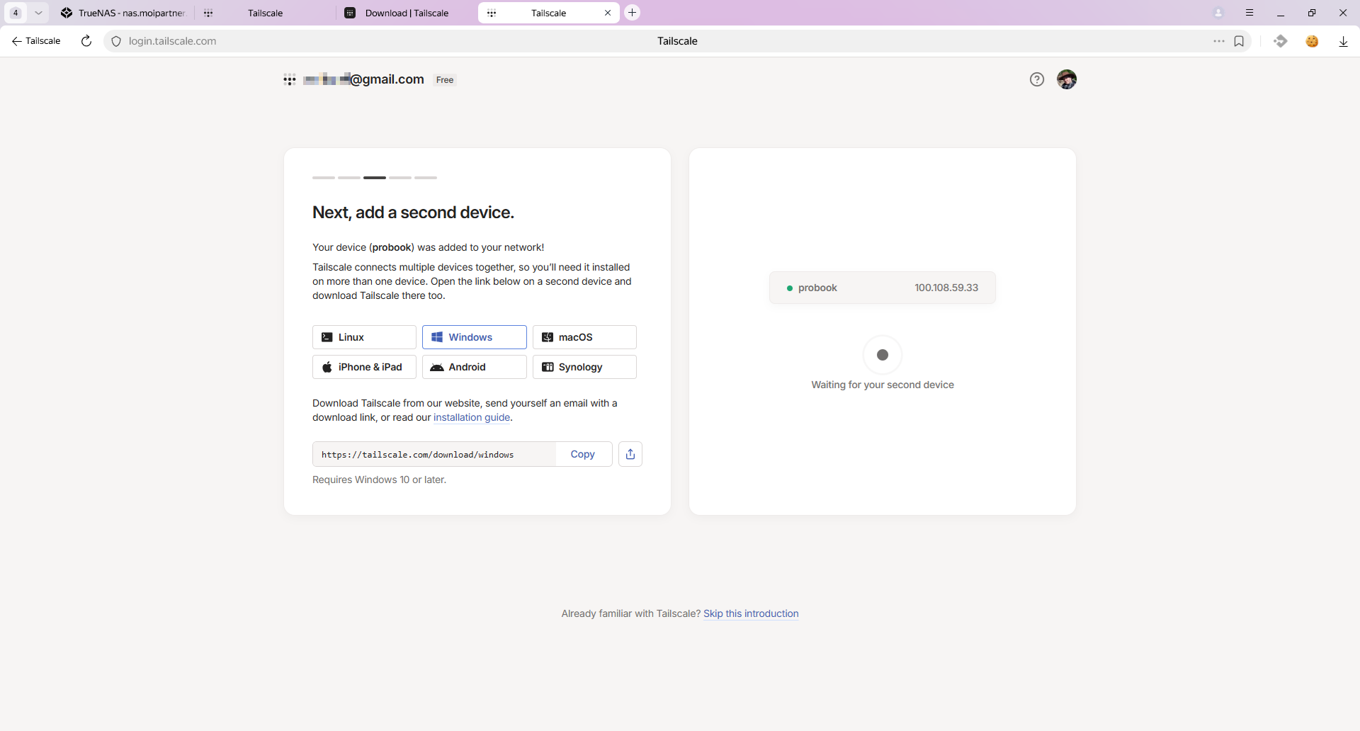 И справа я вижу свой ноутбук, которому выдался некий IP адрес. Система ожидает второе устройство, собственно, которым будет наш NAS. Однако, непонятно как выдать ключ аутентификации. При попытке перейти по ссылке из установки приложение в TrueNAS мы попадаем на эту же страницу. Затем я снизу увидел ссылку Skip this introduction. Совсем не для средних умов, тыкаю.