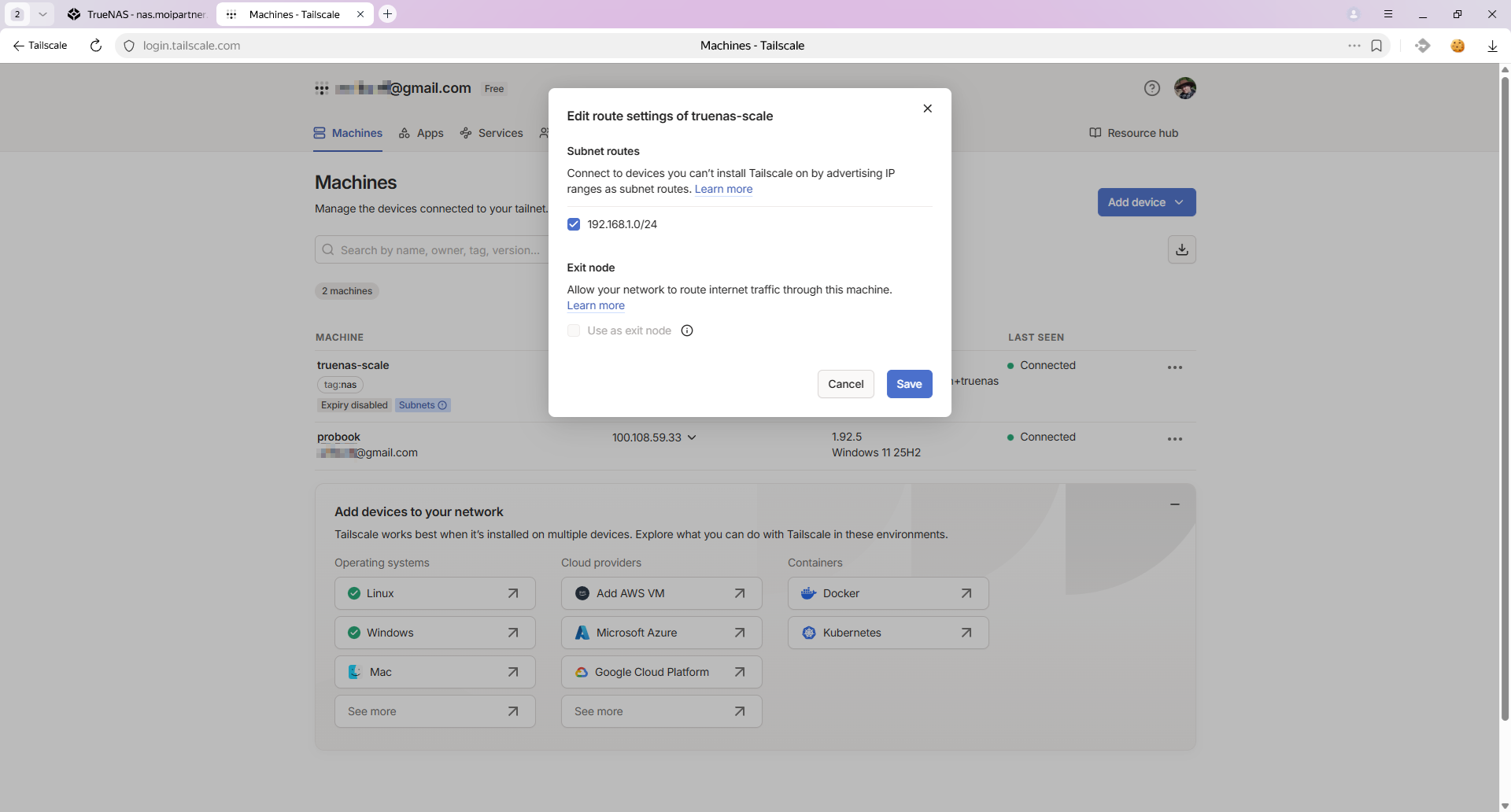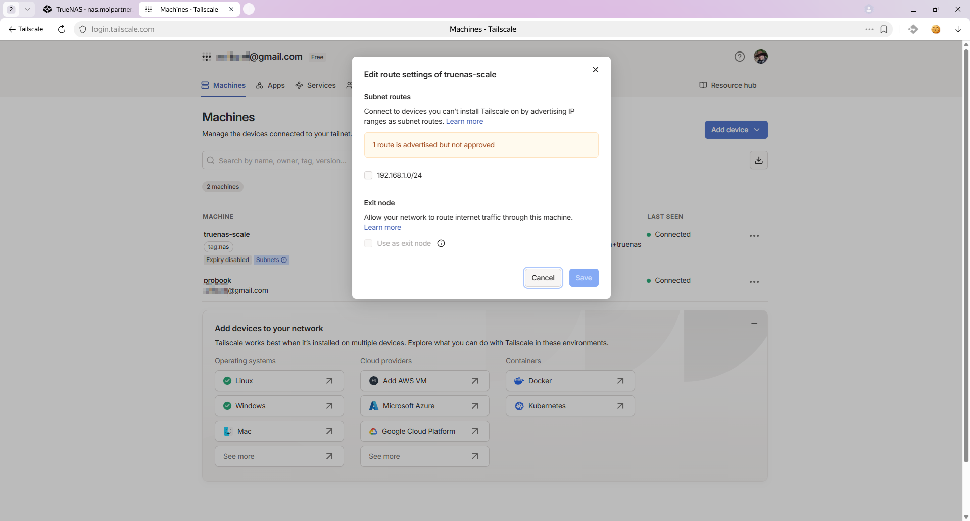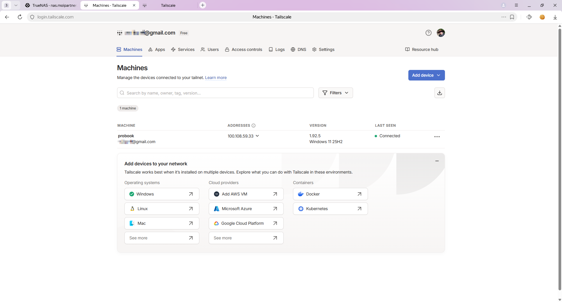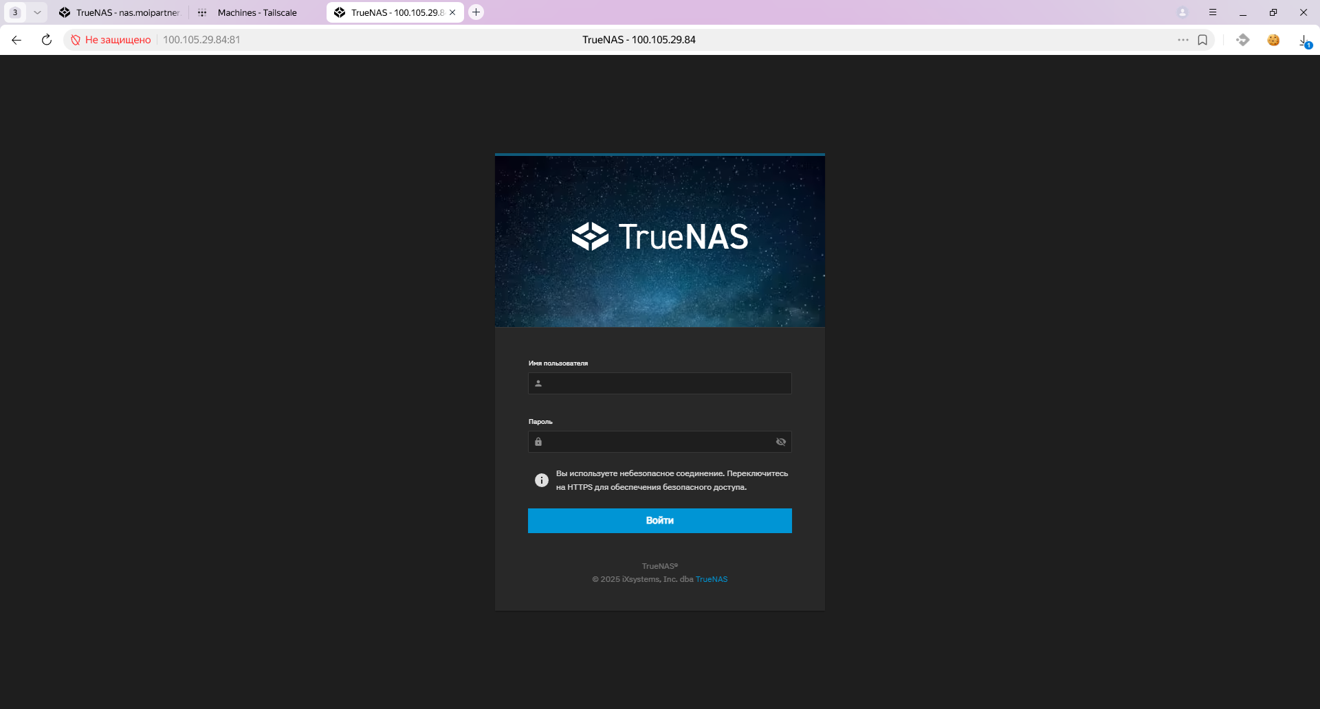 Пробую с ноутбука зайти на интерфейс TrueNAS по выданному Tailscale IP адресу, работает.