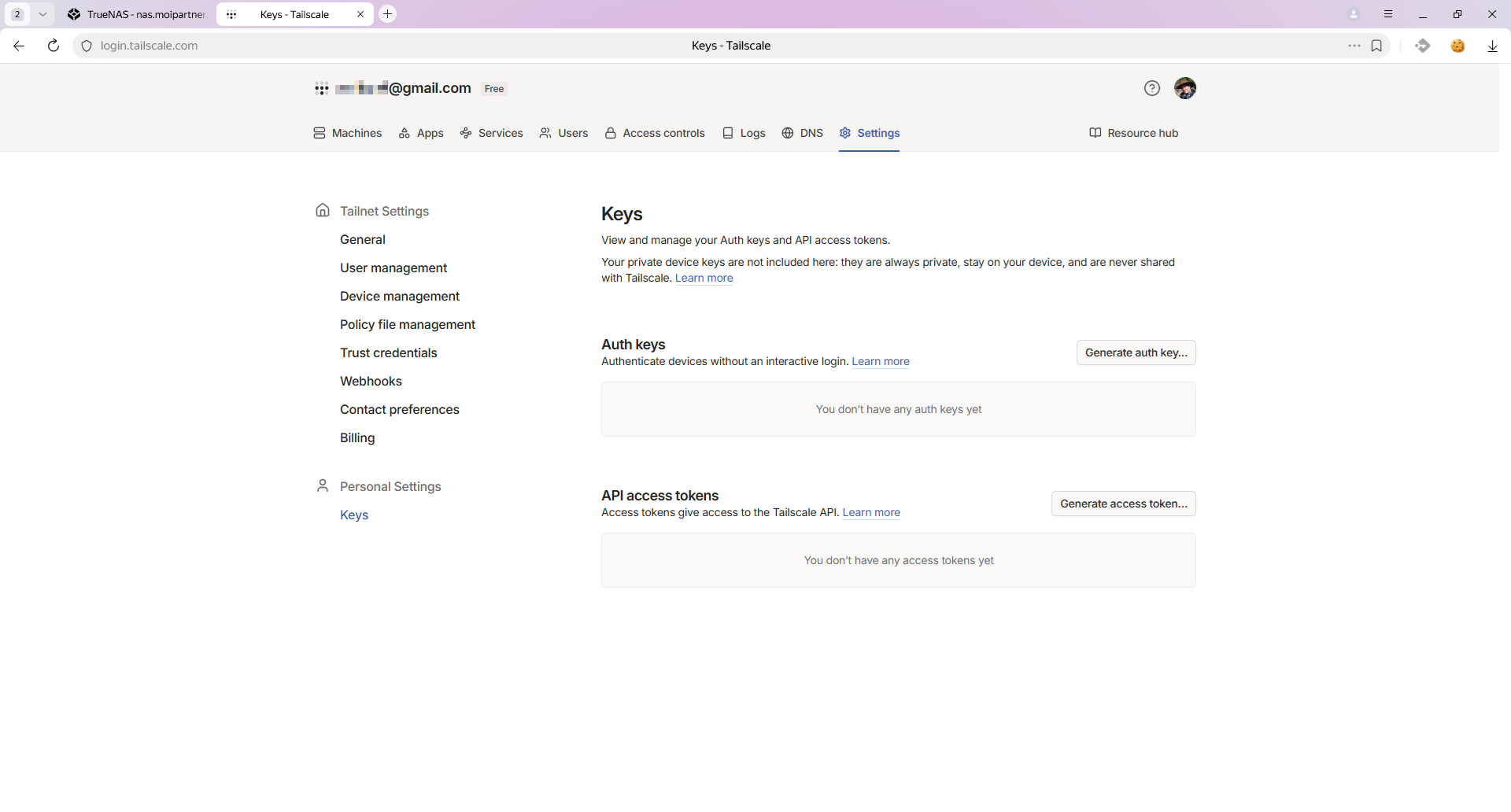 Попали в нормальный личный кабинет. Наша задача: сгенерировать ключ аутентификации для нашего NAS. Наверное, ссылка из установки в TrueNAS заработает. Я жму в Settings → Keys.