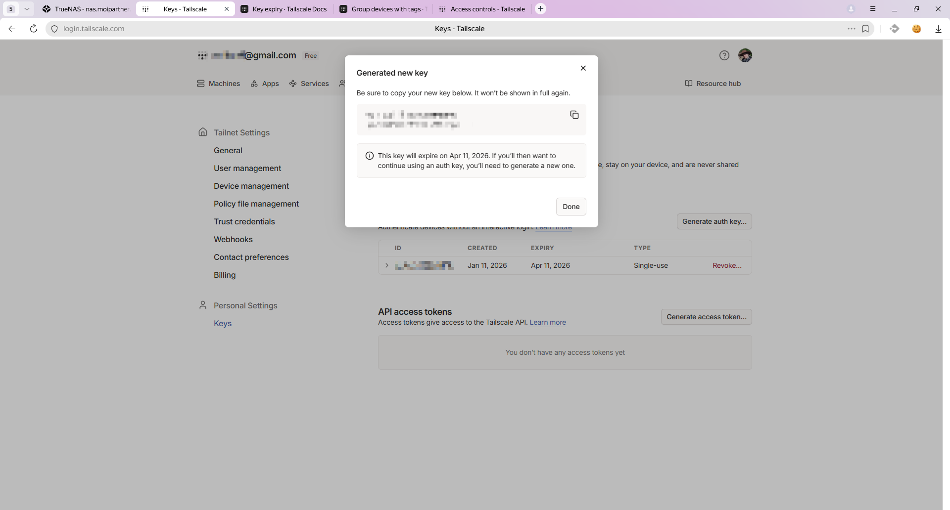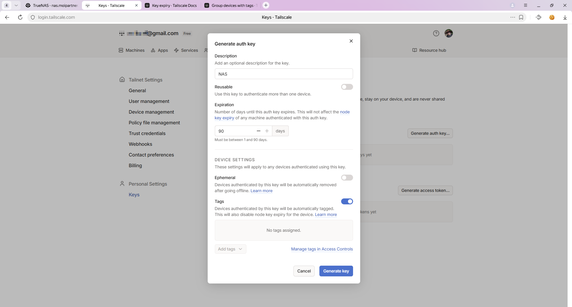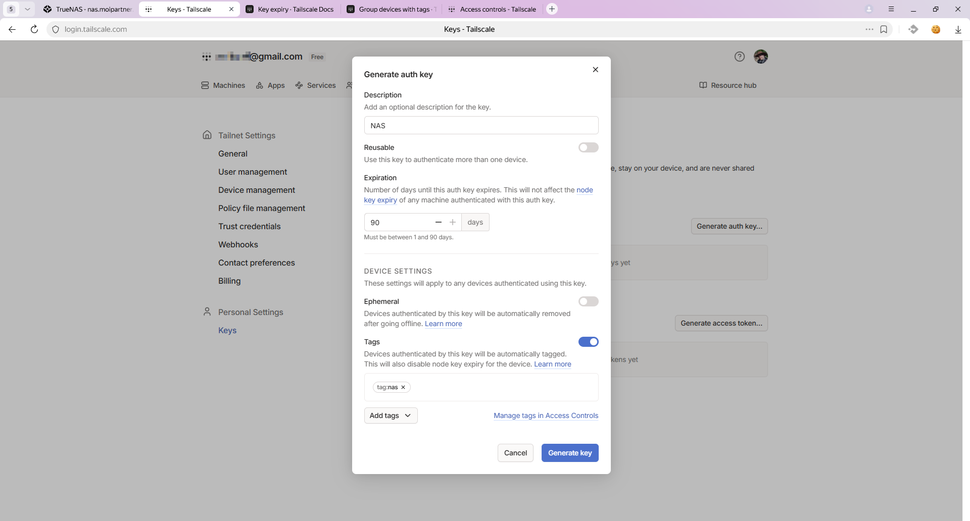 Быстро в описании указал "NAS", чтобы понимать для чего генерирую ключ. И здесь я подвис. Судя по тому, что я вижу, срок жизни ключа максимум 90 дней. Меня это не устраивает, NAS должен автоматически подключаться и без ограничений. Я тут же полез и почитал документацию, оказывается, можно потом в настройках отключить срок жизни ключа для любого устройства, ладно, можно будет позже настроить.