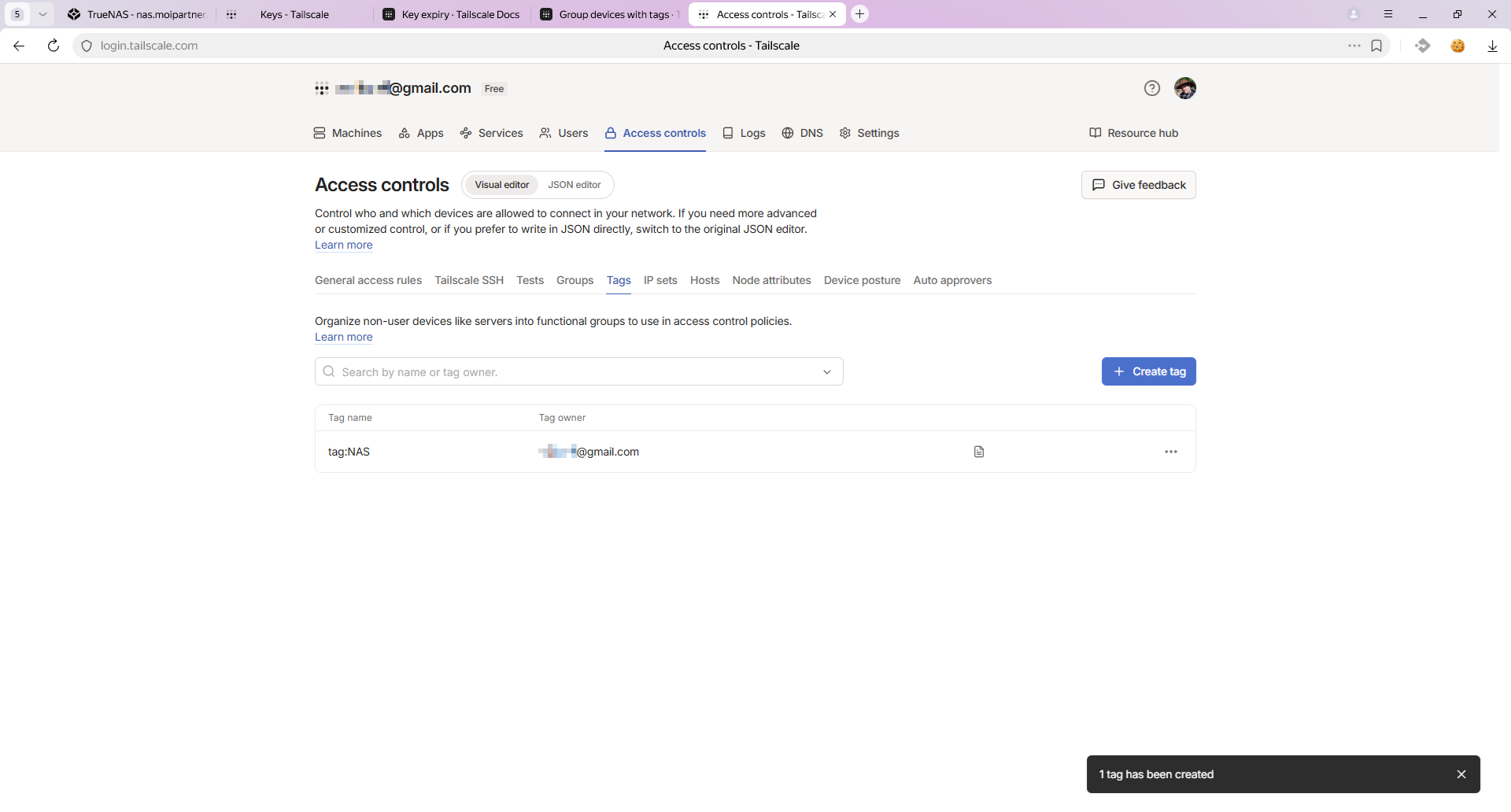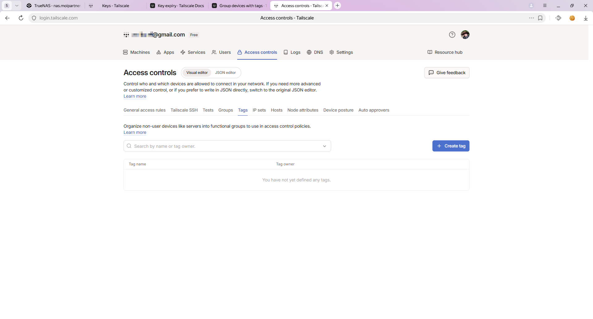 Смотрю дальше и вижу раздел Tags. Здесь можно задать тег для устройства и (о чудо!) ещё одна заметка: " This will also disable node key expiry for the device". Если мы зададим тег для нашего NAS, то не придётся отключать срок жизни ключа, он сам отключится. Включаю чекбокс и появляется ссылка "Manage tags in Access Controls". Открываю её в новом окне.