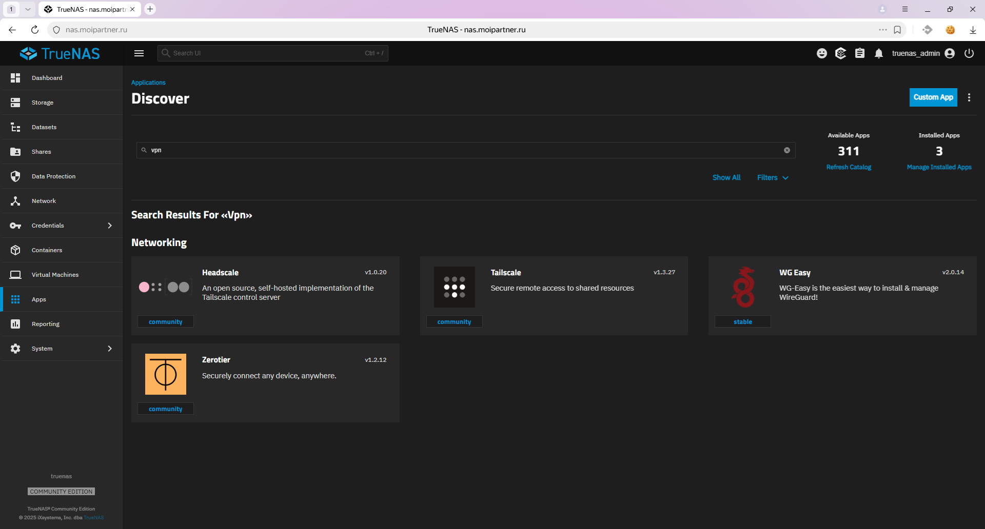 Можно ещё оптимизировать процесс: развернуть на TrueNAS в качестве приложения WireGuard, я его там видел. Поищем приложения по ключевому слову "VPN".