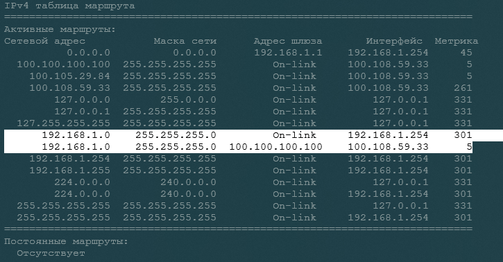 И на ноутбуке появляется новый маршрут. Правда, проверить его не могу, потому как он живёт в той же подсети. Отключаю ноутбук от локальной сети, подключаю его к точке доступа телефона. И...