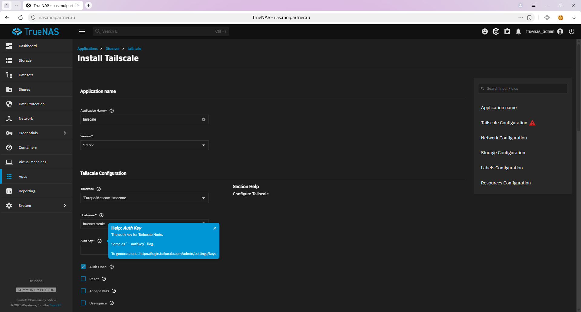 Ставим галки Auth Once и Userspace. Про Userspace еще не факт что так и останется, в некоторых случаях, когда не удаётся получить удалённый доступ к приложениях TrueNAS, на форумах рекомендуют не ставить галку и запускать контейнер от рута. Но я пока следую официальной инструкции, позже можно будет внести изменения.