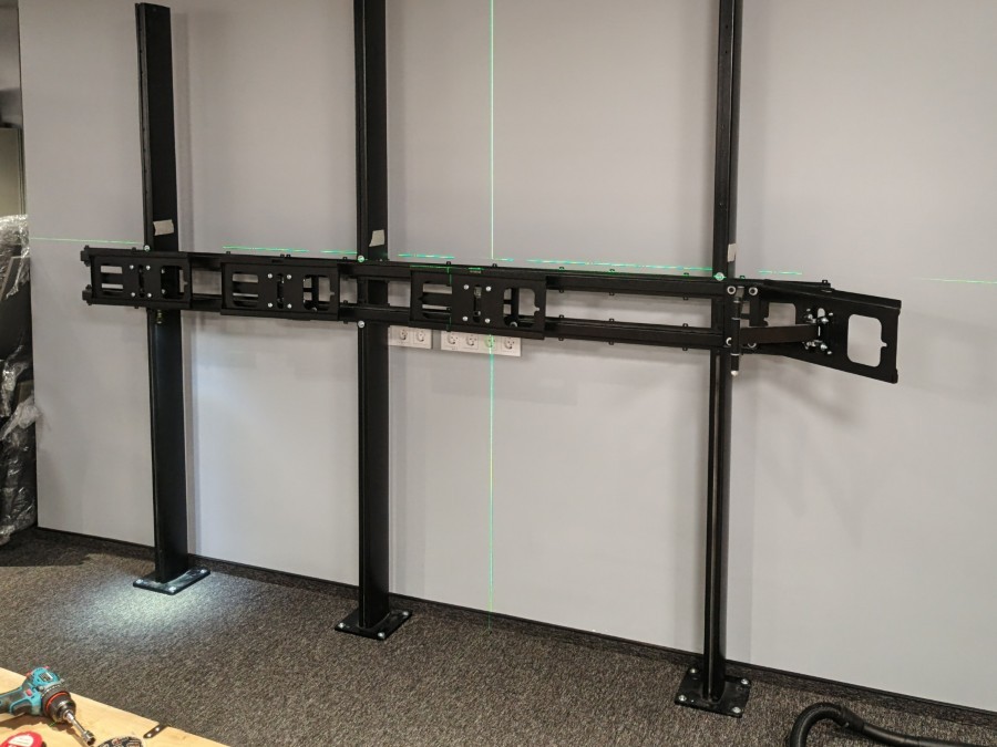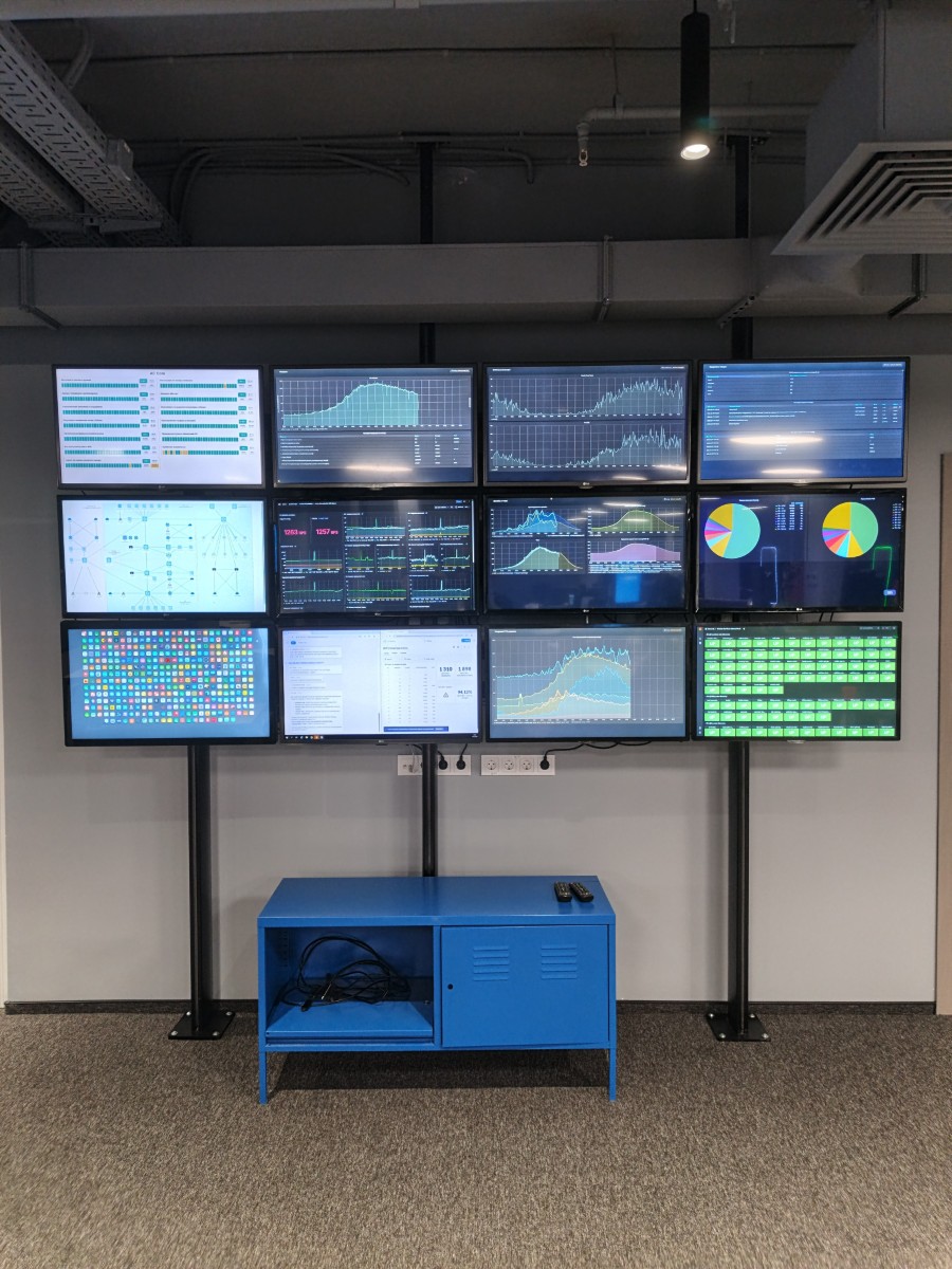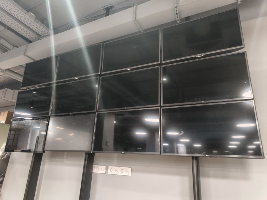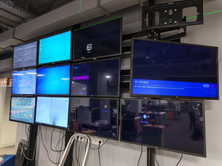 Собрали мониторинг на базе неттопов и телевизоров. Вся система держится на специальных стойках и кронштейнах. Каждый неттоп передаёт изображение на два ТВ. Телевизоры регулируются в нескольких плоскостях.
