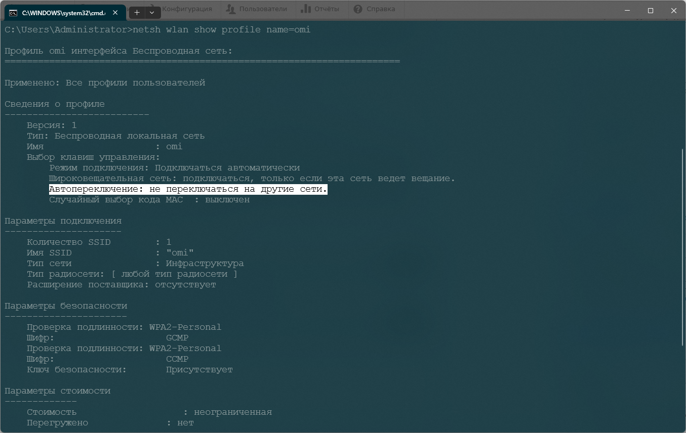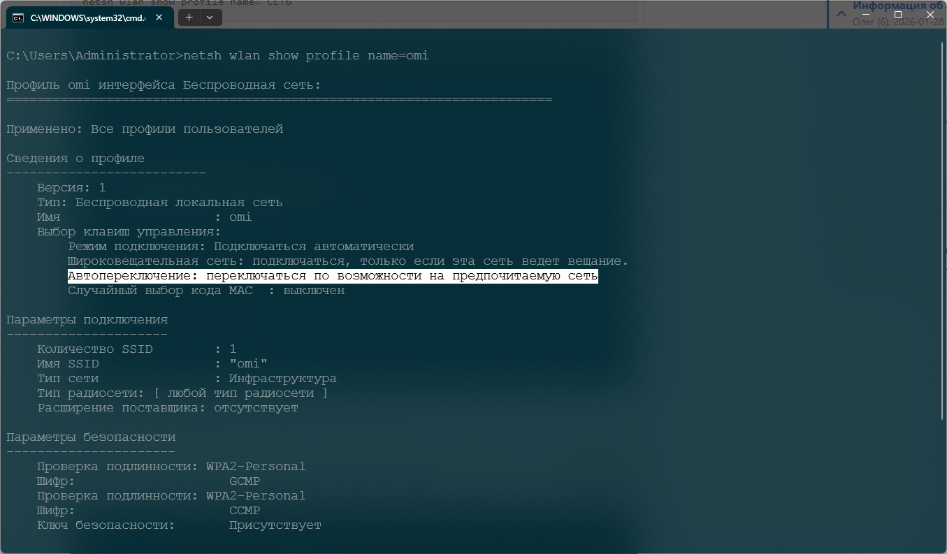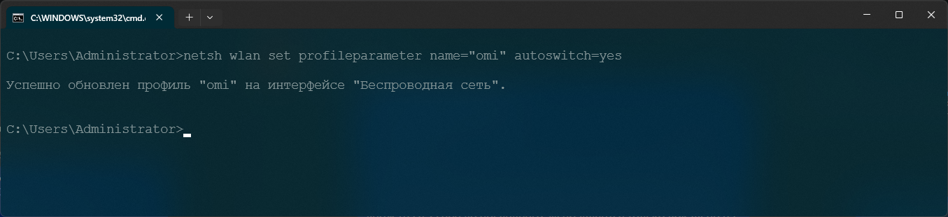 netsh wlan set profileparameter name="СЕТЬ" autoswitch=yes